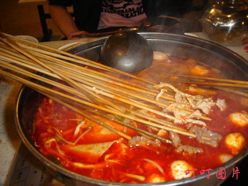 (酸辣烫,)网上好象没怎么介绍过。我也是通过贵阳当地人才知道的,确实很不错,因为这里吃的全是贵阳当地人。和成都的串串香很像,吃完了按这个串串的个数来买单,不同的是这里由成都的麻辣改成了这里的酸汤,看着汤够红的吧。