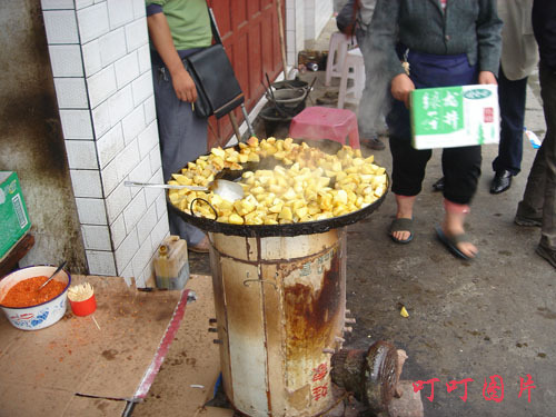 (不知道贵州是不是盛产土豆)到处可以看到他们把土豆切成小块,然后油炸了直接蘸辣椒粉吃。这张照片拍摄于从织金洞回贵阳途中的山村小店。