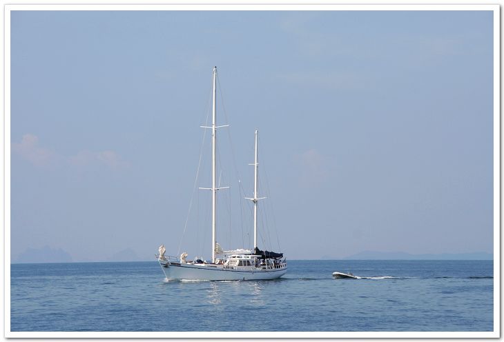 泰国自由行 – 普吉 – PP岛 – Day2 普吉真是座不夜城,我们早上9点起来走在大街上的时候。周围的N多商店都还没有开门。 我们今天就要离开普吉了,定了下午3点的船票。说好中午1点到酒店大堂等来接我们的车。因为昨天在Jungceylon买的眼镜戴着不舒服,应该说是在Jungceylon买的眼镜的时候太过匆忙,忘记调了,所以我们今天一大早就跑来Jungceylon调眼镜。 结果到了Jungceylon以后,里面的N多商店都还没有开门。我们就只有在周围随便逛了一下。一直到10点钟,这些商店才陆陆续续的开门。真有点像香港啊,呵呵。 到眼镜店调试好了眼镜以后,我们又“回扫”了一下Jungceylon。把昨天看好了,但是没有买的东西买下。比如500B两件的情侣T-Shirt,呵呵。 真后悔没有从另外一边回来,我们还是从原路返回的酒店。这样我们就只逛了半个Patong。不过想想为了节省时间么,只有这样了。 在回来的路上,我们又回到Patong Seafood吃了午饭。本来打算点龙虾吃的,但是 他要2800B/kg,而且没有半公斤一只的,只有1公斤以上的。想想就算了… 这次我们点了Tom Yun Kung(冬荫功 – 酸辣虾)。味道还不错,呵呵。 在吃完饭以后,我们就赶到酒店等来接我们坐船的车了。在1:15,我们坐上了去码头的Mini-Van。行驶了近45分钟以后,我们到达了普吉岛的码头。在付了350B/人的船票费以后,船家在我们衣服上贴了个One way的黄色不干胶贴。然后我们就上船了。 上了船以后,发现一船的鬼佬。连个亚洲人都见不到,更不要说中国人了,呵呵。 船出发了。我们就一直站在甲板上看风景~感觉大海的气息。随手照的一张帆船的照片,都感觉像是在画上一样。
