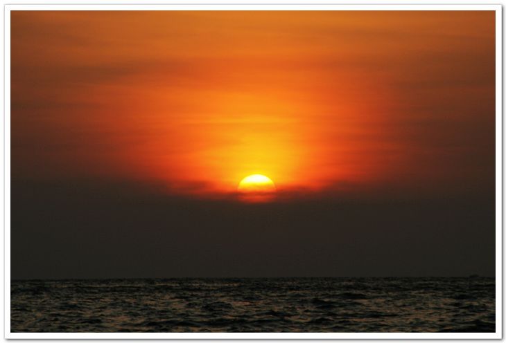 上了岛,就和阿冕联系。马上阿冕就来了,带我们到了他帮我们定的旅馆:Phi Phi Inn。因为Phi Phi Hotel已经定满了,所以阿冕就帮我们定了这。房子条件也不错,价格也比Phi Phi Hotel便宜很多。这是属于家庭旅馆,当然豪华程度就比不上Phi Phi Hotel啦。 因为快要日落了,所以我们决定去划独木舟,到海上去看日落。后来想想,我们也真够大胆的。因为日落的时候是海上风浪最大的时候。而且独木舟遇到大点的风浪,很容易被掀翻…. 在Loh Dalum Bay的沙滩与船家经过一番讨价还价后,我们以150B/hour的价格租了一艘独木舟就向大海中划去。在绕开挡住太阳的大山以后,我们终于看到落日了,真的很壮观! 我们就这样一直守在海上看日落… 看着太阳一点点的落到海平面以下。不过话说回来,太阳落的时候感觉太快了。最多就几分钟的时间,就淹没在大海中了。