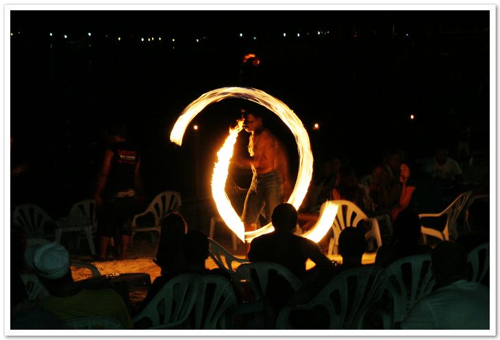 晚上呢,我们就沿着Phi Phi岛的主街一直逛。沿路有很多的Diving Shop,餐厅,手工制品商店,服装店,纹身店,面包店,等等等等。 不过最强的是我们看到耍火棍。想像一下,像孙悟空耍金箍棒一样,但是金箍棒两头还烧着了火。真是非常Powerful!可惜我们没有带DV出来,就只有用相机来拍了。我在这拍了N张照片(N>150),才挑出下面这几张经典的。