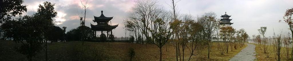 1月30,周五,初五, 这天,吃完午饭,爸妈、哥哥、和我出发去“茱萸湾”公园。 在扬州市区的东北方向,临近“湾头镇”的地方,开发出了一大片风景游览区,就是“茱萸湾”。据说因为这里在汉代时盛产“茱萸”而得此名。而因为这里三面环水,有古运河、大运河、邵伯湖,所以风景秀丽,还被评为了国家AAA级旅游区。以前,这里只是一个大植物园,种植着几十种观赏花卉和风景林,近两年,据爸妈他们介绍,把原来在“瘦西湖”公园里的动物园里的动物全部搬迁到了这里并且加以增添,所以这里同时又成了“扬州动物园”。 我们走进园里(门票30元/人),这是一片面积非常大的公园,到处花木参差、林树纷繁,不过,如果阳春三月来,想来会更美,而这时候,虽说不像北方的冬天那样气温低,植物并没有枯黄一片,倒也有不少绿色,但是,不是春天的那种生机盎然的鲜绿。所以,吸引我们的,就不是公园里的各种植物,而是动物们了。 这里的动物园,因为地界充裕,所以动物们不用像原来在“瘦西湖”里的动物园那样,委屈的呆在笼子里,而是有很大一部分动物散养着,甚至像狮子、老虎、狗熊这样的凶猛动物,也是散养,形成了一片专门的猛兽散养观赏区。而像麋鹿、驼马、山羊这样的食草动物,也能在一片片散养区里自由走动,而游人可以隔着栅栏给它们喂食绿草。 而这里的动物种类,还挺丰富,甚至还有我热爱的澳大利亚这个国家里的鸵鸟、鸸鹋、黑天鹅等动物,要是能有袋鼠、考拉可就更好了。这里还有一片鳄鱼池,只是冬天鳄鱼冬眠,不知道都躲在哪里一条也看不见。 看完了动物,我和哥哥还到游乐区里的“卡丁车”场去玩,让我第一次驾驶了卡丁车,不过我不敢开快,虽然整个车场里只有三辆车在跑,但我只敢慢慢悠悠的开着,只听见哥哥驾着车呼啸着从我身边一次次经过。 接着,我们继续往公园的西北方向走去,与之前风景林中刻意种植的花丛果木不同,这里渐渐是一片片天然的树林,而且,公园边界的运河也显现了出来。 这天的天气还是不怎么好,天上有厚厚的云层,但是我发现有一刻云层缝隙中露出了金色的阳光,抓紧机会把这一刻拍了下来。 这片区域,地形呈一个“尖嘴”样的形状,伸到远处的河水中去。而“尖嘴”的最尖端,有一座塔,好像是为了纪念以前这片地区的治水而建的。 真是有水的地方就有灵气。这里普普通通的一座塔,还有它附近的一座亭阁,配着周围的树林,再加上这时天空中的云竟然有了彩色,竟构成了一幅绝妙的风景画。 从这片区域往回返,途中经过了一片“拓展训练区”,只见林地上一座座用来开展拓展训练的器械耸立着,我还从来没参加过这种活动,所以对这些器械很是感兴趣,只可惜可能是因为冬日游人不多,这些器械都没有开放。 快走到公园出口前,有一大片水塘,爸妈说夏天时会长满荷花。而这个时候,水塘里自然一朵荷花也不见,只有一些残枝留在水面上,但是让人惊喜的是,不经意间,你会发现某一片残叶旁边荡起一圈波纹,再仔细一瞧,叶子底下露出一个小小的脑袋,竟然是一只可爱极了的小小的水鸭在扑楞着翅膀。而水塘上,有一座曲折的木桥。我用我手机的“全景拍照”功能拍下这些,爸妈说,竟有点“清明上河图”的感觉。 整个“茱萸湾”公园占地面积很大,徒步走一整圈下来,是一次很好的锻炼。 离开“茱萸湾”公园,天色已晚,哥哥开车带着我们到了市里,他说有一家叫“大明寺”的素食餐馆挺不错。来到这里,只见是很普通的一家餐馆,整个厅里竟然没有什么客人,让我有点儿怀疑它的质量。我们来到二楼,进了包间,环境很一般。这里的菜都是成套的,我们由服务员推荐点了一套。等菜品上来,我发现还真是挺不错,味道也都挺好吃,不禁奇怪这么好的店怎么没什么客人。这里所有的菜都是素食,这就让我们一边吃一边饶有趣味地讨论究竟是什么材料做的,尤其是那些看上去、吃起来都很像肉食的菜。 这顿饭200元。