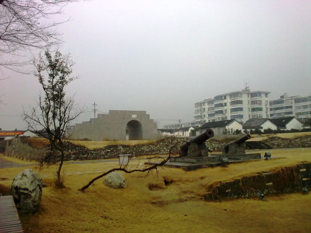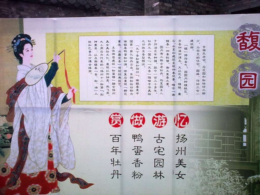 继续沿着“东关街”走,我们来到了“谢馥春”门前。这里以前是扬州著名的生产“鸭蛋香粉”的地方,这里的香粉远近闻名,在旧时,是富人家的小姐夫人们争相使用的牌子。后来,有很长一段时期,“谢馥春”竞争不过现代发展起来的化妆品,曾经没落了很久。但是现在,它又重新发展起来,作为扬州特有的品牌,不仅将以前的工艺继续传承下来,而且将保留下的“谢馥春”的创始人的家宅开放成“谢氏老宅”、“后花园”,联合上生产部分的“粉妆坊”这样的三部分供人参观。 这天我们到门前的时候,看见上面写着,春节期间免费参观,平时要收费。好像是20元(记不清了)。不过,我们进去的时候,门口前的一大片空地还没有完全整修好,还是烂泥地,想以后再回去,整修好了应该会更漂亮了吧。 越过那一大片空地,来到“馥园”。这是一个很小巧的宅院,亭台楼阁、曲折回绕。小楼里面,有好多假人像,有“谢馥春”创始人夫妇的像,还有旧时扬州有名的几个美女的塑像。另外,还有鸭蛋香粉的制作过程的展示。可惜的是,我们参观的时候时辰已晚,现场制作香粉的活动已经没有了。另外,游完“馥园”,绕到后面的作坊去看时,也都关上了门不能进去参观了,但是,隔着窗户,还是能闻到里面馥郁的香气。 离开“谢馥春”,“东关街”里还有一处值得一看的园子,叫“汪氏小苑”,也是扬州保留下来的一处有名的盐商院宅。可惜我们走到的时候时辰已晚,门口售票处已经关门。爸妈说,哥哥进去参观过,说里面还留有旧时的水牢。 走到“东关街”的尽头,有一处古城门样的建筑,一圈残破的砖墙、前面还立有两门大炮、被周围的枯草映衬着,真让人一下子感觉回到了古时候的旧时光。 不过,用爸爸的话说,扬州总是喜欢“造假”,比如“瘦西湖”里的白塔,传说中就是乾隆下江南停留在扬州时,一个妃子推开窗户,说是这里的景色很像京城,添上一座白塔就更像了,于是当时的大盐商听了,为了献媚,连夜用盐堆起了一座和京城颐和园里一摸一样的白塔,第二天妃子一看很高兴,皇帝自然也龙颜大悦,而等圣驾离开后,盐商才赶紧真的造起一座白塔。再比如“瘦西湖”,其实和杭州的西湖一点关系也没有,却非要攀附人家的美名。而这里的这座城门,虽然很显然是后来修建起来而不是从古时保留下来的,却也是假的,城墙都不是砖石建造的,是硬纸板和塑胶板。 走了这么长的一段路,爸妈却并不劳累,反而兴致颇高,还要带我到运河边上去看看,于是,虽然雨已经越来越大,我们还是来到了“解放桥”下面的运河边上。扬州如今的城市建设发展很快,除了我前面提到的“夜景”,还有一处明显的变化就是运河边的美景。凡是运河沿岸,都有长长的绿化带,绿草鲜花、其中还掩映着亭台楼阁、或是反映丰富运河文化的碑刻石牌等,春天的时候沿河漫步,是很舒心的一件事。 这里的运河边上,就建有一个牌坊,为了纪念这里古时曾是繁华的渡口,名为“东关古渡”,牌坊下面,紧靠河边,还有一幅长长的壁画,反映隋炀帝巡游江南的情景。 河边上,一位渔人在自己的渔船附近捞“螺丝”,这也是我记忆中小时候的街边美味之一。将螺丝用像做“麻辣小龙虾”那样的做法炒了,用一根针或是牙签挑出它里面的肉来吃(会吃的人就不用任何工具,一吸就能吸出来)。可惜后来担心卫生方面的原因(比如寄生虫什么的),长大后就再也没吃过。