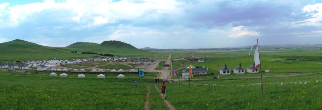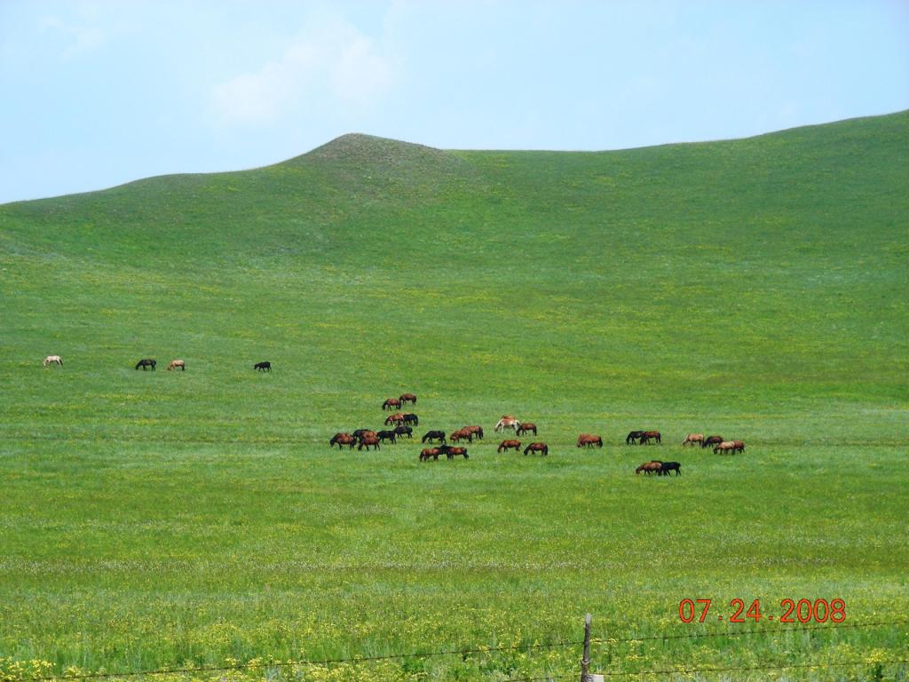 进入景区,又见那蓝天白云下漫山遍野的“绿地毯”,点点的白色蒙古包点缀其上,美丽画面令人心旷神怡。军马场部是一个不大的镇子。镇上以客栈、宾馆为主,经营者多是旺季来此做旅游生意的外地人,像我们入住的怡人山庄老板老马一家就是赤峰来的。山庄是一个大院,三人间,80元/人,条件一般,也谈不上网友所描述的“怡人”。不过据老板娘说每到周末这里便人满为患,房价也会飙升。当地谣传北京因奥运会已实施戒严,众人还奇怪我们是怎么出来的。哪有的事!。