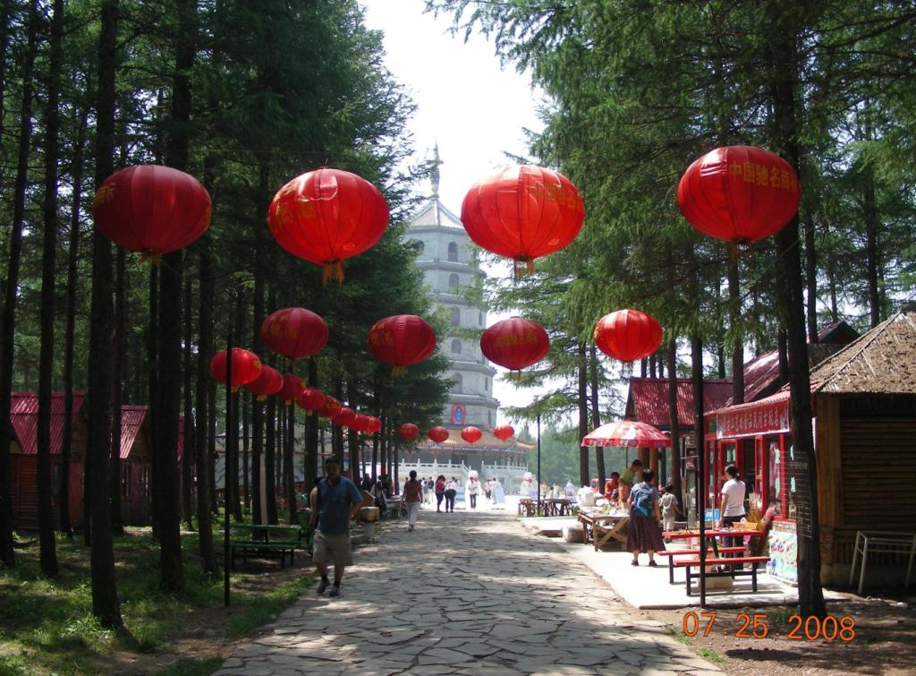 离开七星湖,穿过场部,经过月亮湖(另需门票,放弃),来到塞罕塔景区。这是最后一个景点,也是最有人气的景点。白色的宝塔高25米,火箭式的塔体直插云霄。景区的石子路两旁有各种小摊,头顶挂着一串串红灯笼。登塔另需25元门票,一锤子买卖,这点钱倒还出得起。登至六层塔顶,了望四周,是一望无际的林海、草原、点点牛羊,顿觉心胸开阔。如果不是薄雾遮挡,通过望远镜可以看到几十公里外红松洼的风车阵(风力发电站)。