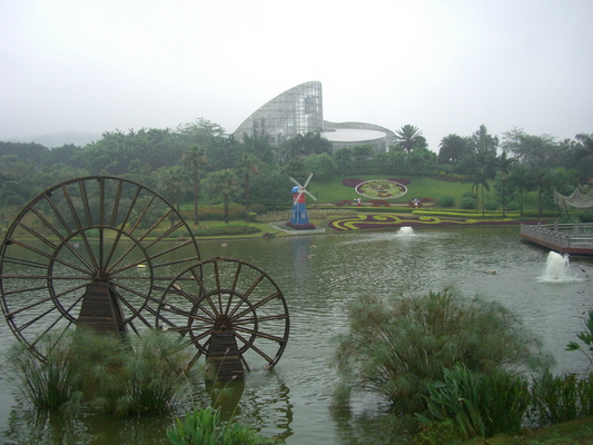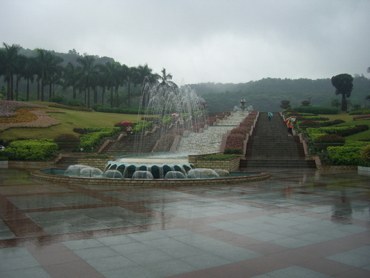 5月29日 一大早起来又开始了新一天的行程。早餐又去了那家包点铺,吃了水晶蒸饺、喝了杯豆浆、还吃了一个叫蟹棒紫菜卷的小点心,都还不错。 从陈家祠广场对面的公交站坐了旅游1线去云台花园。上午雨一直淅淅沥沥地下个没停,不过这种天气反而让我能在游人稀少的云台花园慢慢参观。云台花园在白云山下,旁边就是上白云山的索道。一进大门就被里面的景色迷住了,门口有一个圆形的小瀑布,里面有许多小圆形的小柱围着一个大水柱。前方就是很多的台阶,台阶又分为三部分,左右两边是对称的大理石阶梯,中间则是特制玻璃铺砌而成的。有清澈的流水沿着玻璃台阶缓缓流下。沿着台阶向上走来到了一个大平台,那里有一个小湖,湖中间有一个小型的喷泉。在雨中看这些流水、喷泉,真是蛮有趣。 站湖边的这个小广场上视野很开阔,整个花园都尽收眼底:湖的前面是一个罗马柱廊,望向它的前方,都是郁郁葱葱的树木,远处应该就是白云山吧。右边有一个花钟,就是由植物修剪成的时钟,还有两个棕色的植物米老鼠耳朵,很是可爱。时间的钟面、数字等都是植物组成的,可时针分针都是真的,整个花钟还是可以计时的呢。左边望去是一大片的绿草坡,上面有很多转动的小风车,各种卡通人物塑像,比如:功夫熊猫、蜘蛛侠、小鱼尼莫、hello kitte、孙悟空、还有我最喜欢的叮铛猫等等。 沿罗马柱廊往上走,不久就来到了玫瑰园。玫瑰园里当然会有很多盛开的玫瑰花啦。这里的玫瑰品种很丰富,有:金徽章、彩云、圣诞白、黑玫瑰等等。因为雨下得很大,撑着伞,不方便看这些艳丽的花,而且还有不时有雨滴飘到身上来,只得尽快躲到玻璃温室去。从玫瑰园到温室的路上还见到了许多的图腾柱。图腾柱形态各不相同,让人仿佛置身某个非洲土著部落。玻璃温室其实是一个小小的室内花园,里面有三大类的植物,分布在花园中的不同区域。其中一个区有许多的棕榈植物,看这些植物的名牌很有趣,比如有些植物以貌取名,如酒瓶椰子、三角椰子、老人葵、帝王椰子、狐尾椰子等;有的则以地取名,如海南椰子、台湾海枣、荷威棕、也门铁等。 温室最引人注目的是各个品种的兰花了。见到了许多吊挂在花格中的兰花,据说有种蝴蝶兰当花梗上的花全部盛开时,宛如一群蝴蝶在翩翩飞舞。可惜那些吊兰都挂在比较高的空中,没办法细看。我只能拍了些地面摆放的盆载兰花,像我很喜欢的具有茹雅气质的英国兰、名字很有湖南特色的辣子黄花、比较名贵的石斛兰等等。 温室中还有一小块种满了各式仙人掌的沙坪,看那么多的仙人掌仙人球集聚在一起很好玩。 从温室中出来后去了另外一边的草坪看那些卡通塑像,还去了一个有许多卡通玩偶的小展馆,里面有一个大大的阿童木的塑像,还有一些展柜摆满了小小的卡通玩偶,大多是日本漫画里的,可我认识的只有美少女和侦探柯南。 依依不舍地从云台花园出来后又坐公交旅游2线回到了陈家祠,然后坐了旅游公交1线去了传说中广州的富人区——二沙岛。下车后就到了广东美术馆,里面有许多人参观美术展,15元的门票。本来想去看看的,只是恰巧雨停了,就赶紧跑到旁边的星海音乐厅去逛去了,因为临近六一,音乐厅里刚好有喜羊羊与大灰狼的舞台剧在表演,见到很多看完演出刚出场的家长和小朋友。在音乐厅旁的江边吹了一会风,又沿着公交车来的路线往回走。二沙岛上绿草茵茵,树影婆娑,岛上分布了很多的高档住房,不过这些小区的周围都修了围栏,围栏上要么载种了植物要么用塑料的草坪覆盖,竟像是藏在深闺的大家闺秀般难寻真容呢。经过一个体育场后就没走一会就离开了二沙岛,本想继续搭公交车,可无意中发现在公交停车点的对面就是东山湖公园,于是进去走了走,门票3元,觉得没有很大特色,就在公园里的湖边呆坐了一会,看了看那一小片的荷花就离开了。 从沿江东路继续搭旅游公交2线到了天河城。一下车就见到人声鼎沸的宏场广场。在宏场广场上的美食小店解决了我的中餐,没来得及细逛天河城就去寻来时车上见到的南方报社了。途中经过了南方人才市场,还去二楼瞄了几眼,里面的招聘单位和应聘人员都不是很多,很多档位都是空的。 从南方人才市场出来,一路上一边欣赏路边的芒果树,一边在想:树上结满的这些青青的芒果到底可不可以吃呢?。走了两站路就见到马路对面的南方报社,因为每周都必买周方周末看,很喜欢这个敢讲真话的报社,想见见它的真容。犹豫半天还是没去里面参观,只是在街对面拍了拍报社的外景就离开了。 从南方报社坐204路公交车到了中山纪念堂。下车后一眼就见到了那座恢宏壮美、富丽堂皇的八角建筑。中山纪念堂前矗立了中山先生的铜像。铜像前面是一个大草坪,草坪外面围着一盆盆争奇斗艳的鲜花。纪念堂呈八角形,正面矗立八根柱子,让纪念堂显得更加雄伟。在纪念堂正门上方写着中山先生的手迹“天下为公”。字迹苍劲有力,使人对中山先生为公天的高贵品质不禁肃然起敬。 走到中山纪念堂左侧面后,一在道门外见到街对面就是越秀公园,只是铁门把我们锁在纪念堂这边无法出去,只能望公园兴叹了。不过柳暗花明的是,沿纪念堂后面走到纪念堂的的右侧就有一个门是开着的,于是我兴奋的从侧门过马路到了越秀公园南门。 花5元买了门票后就开始了漫长的爬山,爬了一小会在一个