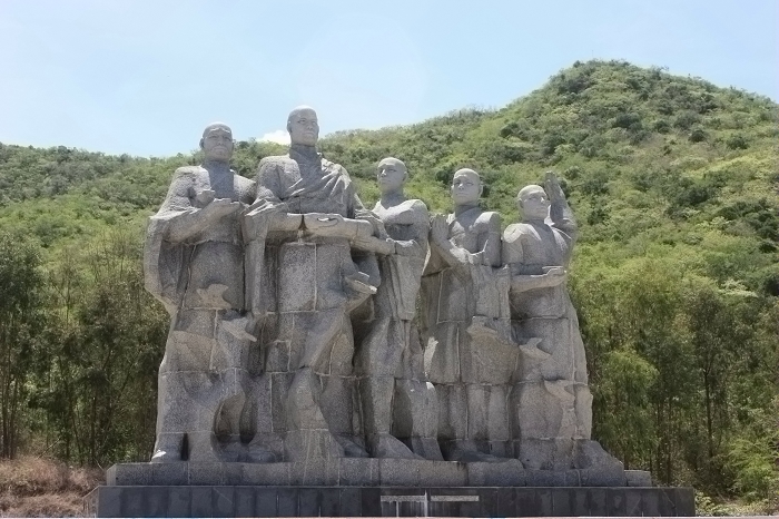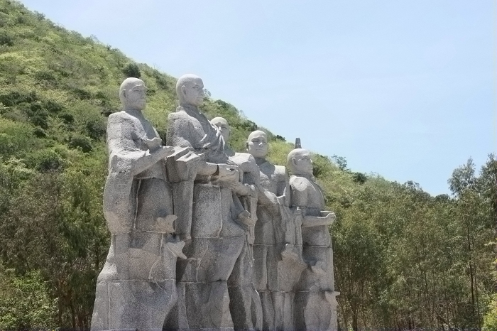 (崖州湾) 鉴真大师一行经过在海上一个多月的艰苦航行到达日本,受到日本君臣的欢迎。鉴真大师在日本创立佛教律宗,以扬州大明寺为蓝本在奈良建唐招提寺,并建戒院为日本天皇和诸臣授戒。鉴真大师给日本带去了先进的中国文化,在日本无私地贡献出了一切。763年在日本圆寂,安葬于唐招提寺。 随着鉴真和尚的到来,日本的出家和授戒制度得到了逐步的确立。圣武天皇时期,由于大批民众私自出家,所造成国家税收不平的现象此时也有明显的好转。那种以为出家就可以逃避纳税的现象逐渐得到了截止。尽管鉴真是一个佛门人物,然而,他的到来却让日本的经济制度和佛教政策走向了一个良好的发展方向。 或许人们不仅要问:鉴真一行对于日本文化史、宗教史、艺术史等真的起了那么重要而深远的影响吗? 的确,鉴真的东渡看似是一个佛教的僧团组织,实际上却是一个规模宏大完整的文化技术传播团体。成书于公元779年的《唐大和尚东征传》曾记载,随鉴真和尚赴日本的僧人中,有雕刻玉器的、有雕塑人像的,有镌碑的,有懂得铸造工艺的,有擅长绘画和书法的,有精通医药医术的,还有擅长手工的建筑师。可以说,他们把当时最成熟的大唐帝国的艺术与科技文明全面地介绍到了日本,对日本后来文化历史的发展产生了极其深远的影响。难怪,日本人民以崇敬的心情,缅怀鉴真的伟大功绩,尊他为“过海大师”。 鉴真盲目航东海, 一片精诚照太清;舍己为人传道艺, 唐风洋溢奈良城。 这是1963年为纪念鉴真逝世1200周年,著名诗人了郭沫若先生写的诗句,他热情讴歌了鉴真崇高的献身精神.度评价了鉴真为促进中日两国佛教的友好往来和文化交流所做的巨大贡献。 鉴真登岸群雕是由国家著名雕朔艺术家林毓豪雕刻,林毓豪是海南崖县人,1964年毕业于广州美术学院,其著名作品有《南京雨花台革命烈士纪念碑》、《鹿回头》等,1997年离开人世。 1994年,鉴真登岸群雕在大小洞天落成后,当地群众乃至国际友人纷纷前来谒拜凭吊,80高龄的日本高僧孝司夫妇前来谒拜并取了一小袋土壤、石子带回日本,以作谒拜纪念。全国政协副主席、中国佛教协会会长赵朴初,1994年1月专程前来凭吊《鉴真登岸》群雕,留下了三句话:“想不到”、“了不起”、“功德无量”。