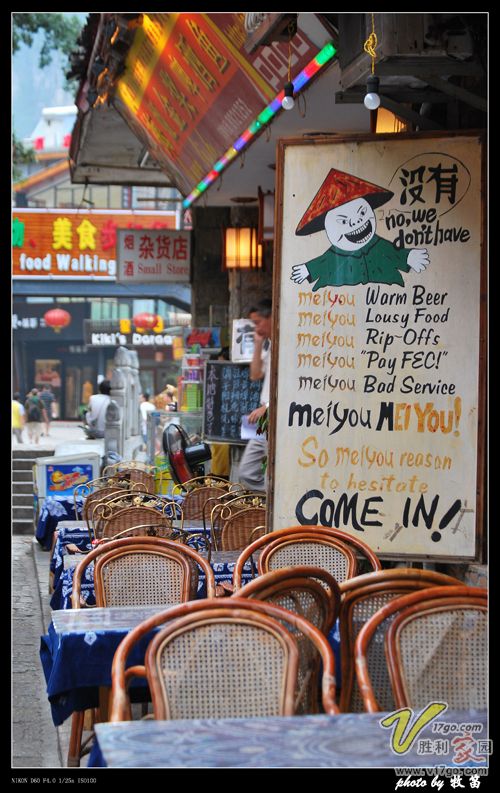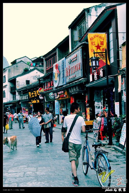 还在往阳朔的车上时,收到投宿店主萧竹的短信,让我们到了打他们电话会来接。心下正纳闷不是说好了我们自己找的吗?下了车才发现全城停电,但是停了电的阳朔街头,依然人群密集,只是再也找不到D7的灯箱标志,这才体会了店主的细心了,呵呵,打了电话,竹子很快出来接了,一见面就热情地把女孩子的箱子提了过去,进了D7摄区的房间,有宾至如归的感觉,满意满意......这里提提D7摄区,是在www.sozhen.com中国古镇网上点阳朔进去后找到的,因为自己喜欢摄影,看到该店有免费提供脚架所以欣然前往投宿的,店是两个深圳小伙子开的,热爱旅游和摄影,骑行过西藏,有很强很独特的户外旅游经验,年青人彼此交流一下,气氛那是相当的融洽的,HOHO~~~~他们那古镇的优惠券可以用,其实两店主萧竹和杯子都是很好说话的人,和气有活力,我们在那住了四晚的三人间,一个人一晚就30元,这么热的天,整夜都开着空调,店主一分也没多要啊,他们在淘宝上有店,要去时和他们说好价格,直接付款就OK了!不喜欢做攻略的朋友,完全可以去了后,把自己交给竹子和杯子,让他们给你们出建议,玩好整个阳朔。