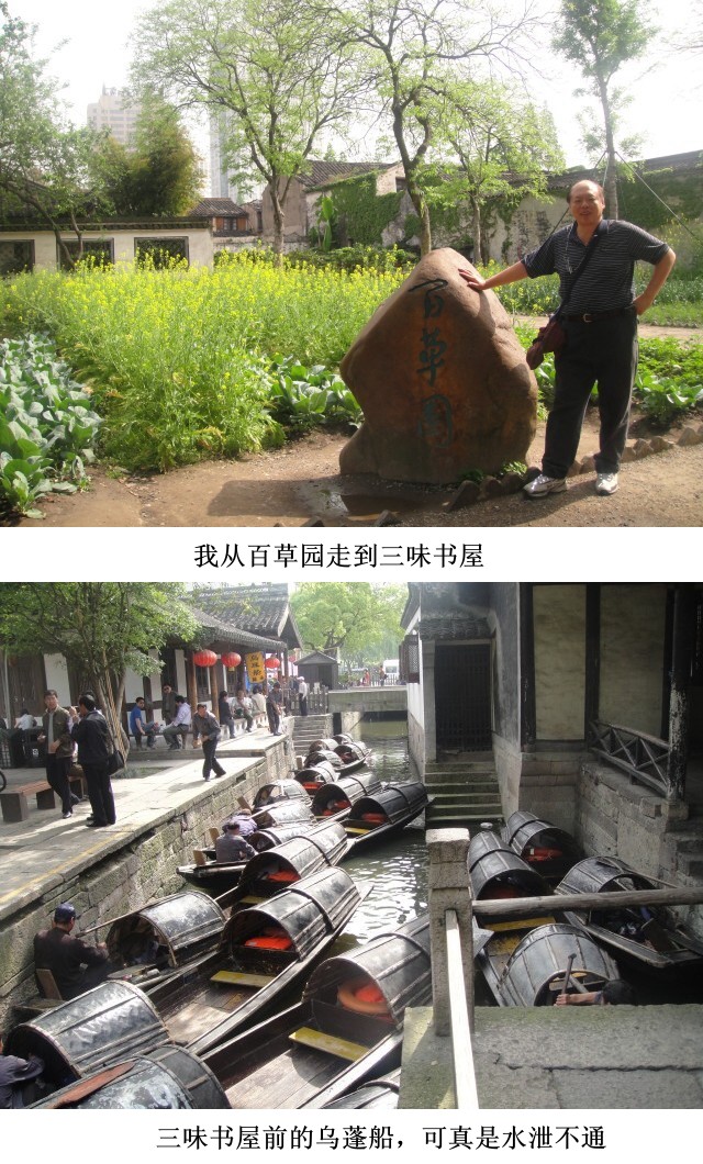 从百草园到三味书屋-鲁迅故里游 次日早晨,坐在老台门大厅的四方桌,吃着免费提供的早餐,虽然只有稀饭、馒头、包子、油条、梅干菜、豆腐乳,但是吃得十分清爽。一边吃一边打量这客栈,每栋房均为木制楼阁,分别取名进士阁,翰林楼什么的,哈,原来一觉醒来我中举成了进士。 走出老台门,过了小桥转个弯就是鲁迅老街,时间还太早,有些店铺还没开呢,我对小店中的那乌毡帽极感兴趣,试戴了一下,放弃了。走进了鲁迅故居-周家新台门,从书房转了个弯,来到鲁迅童年最喜爱的百草园,文章中的菜畦、皂荚树、石井栏,点点滴滴呈现在眼前,说实话,在小孩子的眼光是很大的一个空间,难怪鲁迅玩得不奕乐乎;我曾回到小时候住的地方去看看,印象中有个很高的防空洞,当时还的爬个半天才上去,后来一看,还没我肩膀来的高呢,可见同一件事情在不同的时空,不同的人,看起来都不会一样的;离开百草园,照着标示牌走到风情园,这里比较气派,戱台,楼阁,看的出来,周家原是有钱人家,可是他们家因科考舞弊而没落了。