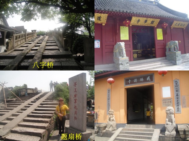 来到广宁桥直街的龙华寺,红色的大门,门前有座碑坊写着「龙华证道」,一旁就是广宁桥,突然想起桥东首有个绍兴仅存的闸桥,名为「龙华桥」,走过去一看,果然不错,有个破旧的小石桥缩在角落里,桥两旁石壁有两道沟槽,这是调节水位用的,现今桥已不通行人车,桥下堆积了垃圾,虽然据说是个保护古迹。 师傅费力骑着三轮车,带我们沿着中兴路再往北走,一路闲聊中,了解原来师傅是位打过越战的老兵,只因多生了一个儿子,只好退伍靠劳力维生,拉拔大两个小孩,不过,老大现已教书赚钱了,日子比较以前好过了。 题扇桥与戒珠寺的故事-王羲之大师