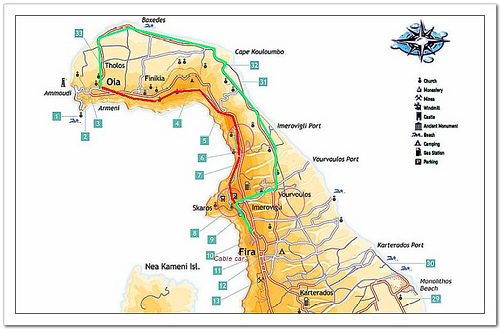 Oia, 又称Ia,在圣岛的最北端,那里是圣岛的尽头,再往外就是无边无际的大海了。日落时分,选一个观景的地方,面对西方望出去,是一览无遗的爱琴海,加上美轮美奂的落日,所以Oia被人称为世界上最美的观赏日落的地方。 从Fira去Oia,可以坐公车,也可以徒步前往;当然自己开车去是最方便的;因为公车最后一班是下午8:55分;一般看完日落,我还要再停留一段时间,拍晚霞和落日的余晖,所以真正拍完,基本上是9点以后的事了;那时回Firostefani的酒店就只有坐出租一条路了;在Oia的公车站台上,是排队等候出租的地方,我们一天见识到这个队伍,那叫一个长啊,而且估计绝大部分人都是回Fira及附近地区的:开车从Oia到Fira单程需要半小时,来回就是一个小时,那排在队尾的游客,不知道什么时候可以等到车? 下图是圣岛Oia部分的地图: