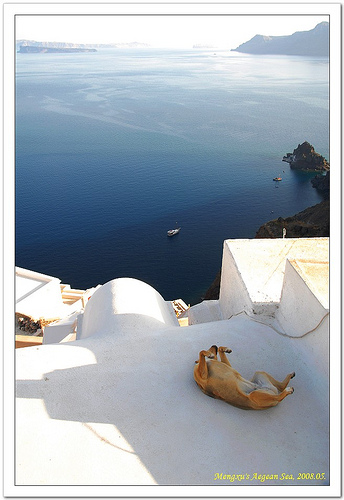 绿线是开车的道路;红线是沿悬崖开辟的徒步路线;我在做行程时,特地安排了半天的时间想徒步去Oia的;这一条Rim-to-Rim hiking trail,全程需要3小时才能走到Oia,据说一路上是令人窒息的美景;为了走这一条路,我还专门在希腊旅行前,买了Keen这个牌子的 hiking sandals,这样又能走路又不热;只可惜计划赶不上变化,徒步的那一天,一早起来去Fira买去克里特岛的船票,结果当天的票有,后天的也有,就是我们要的第二天的票卖光了;我们不甘心,又跑了一家旅行社,一样的结果。据说是因为游客少,临时取消了一班船,两船并一船,所以船票紧张;圣岛也没有去直接去克岛的班机,得坐飞机先回雅典,然后再飞克岛;我不想这样折腾,没办法,只有买了后天的船票;然后回旅馆,借用前台的电话,修改后面的行程,圣岛的房间延长了一晚;克岛的旅馆减掉一天,取消租车订单;再重新订车,前前后后就折腾掉两个小时都不止。真是要感谢Ira Hotel的经理,他非常热心地帮助了在困难中有点手足无措的我们。 全部搞定后,吃点东西,看看时间,已经是下午2点了。徒步去Oia,加上途中拍照,可能3小时不止;到了Oia,如果先吃晚饭,找地点拍日落的时间就非常紧张了;不吃晚饭先拍日落呢,吃饭得等到9点以后,那时应该会饿得前心贴后背;我身上的脂肪虽然丰厚,可是却一点儿都不禁饿;肚子里咕咕叫的时候会恶向胆边生,情绪失常;加上拍完回Firostefani的酒店还有很多的问题;想了半天,只有放弃。赶紧跑到酒店对面的租车点,又租了一天的四轮摩托奔向Oia。 Oia的街道相对Fira的来说,要干净整洁很多,店面的层次感觉也高档一些,如果不是地点比较偏,去岛上其他的地方不方便,我一开始是想住在这里的。这天我们早早来到Oia,先到处逛了一下这里的小街小巷。 看到这只狗狗,四脚朝天,在这么美丽的地方,居然在一阴凉地里打盹!估计是天天看,已经严重的审美疲劳,不过这形象也忒差了点,我不禁哈哈大笑,赶紧捏了一张;幸亏手脚比较快,拍完后再看那狗狗,就已经翻过来,趴着睡觉了。