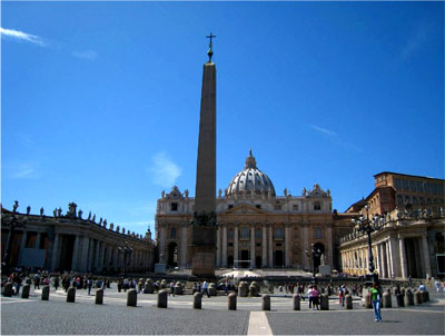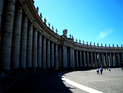 第三天,我们照例起了个早,把行李寄在前台。熟门熟路的坐上地铁,很快就到达梵蒂冈。天气不怎么好,刚出站就下起了小雨,幸亏今天圣彼得教堂不需要排队,否则就淋惨了。 教堂内精美的拱顶 华盖——下面还有人哦~ 教堂外漂亮的走廊和柱子