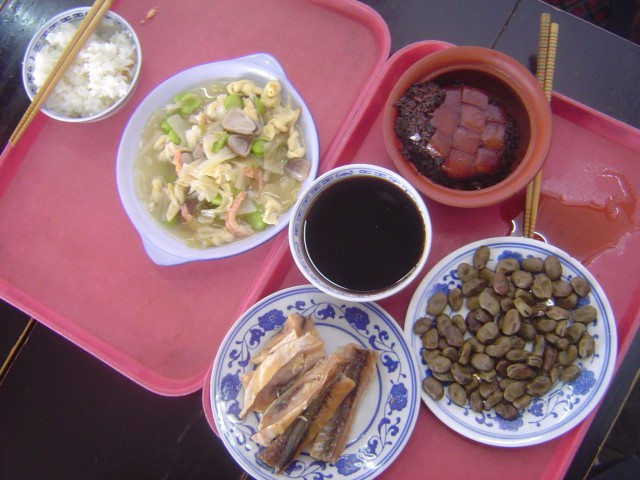 第二天中午在「咸亨酒店」吃的,但见店门口站着那鼎鼎大名的孔乙己像,店中不很大,但是人山人海啊,没法子,还是得吃啊;首先得到右边窗口排队买卡,点了东坡肉、咸亨八珍、茴香豆、醎鱼干,当然没忘拿一碗颜色乌黑发亮的绍兴老黄酒,不错,真的好好喝,临走还用热水瓶装了满满一瓶,尤其是那茴香豆,咀嚼起来回味无穷,真是下酒的好东西,至今仍念念不忘,写着写着不禁咽了一下口水。