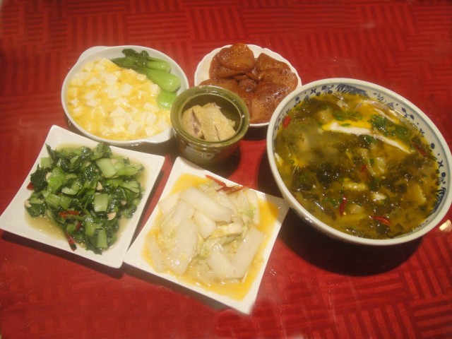 醉鸡,蟹粉豆腐、酸菜鱼汤,两个半份青菜、桂花糖藕 |