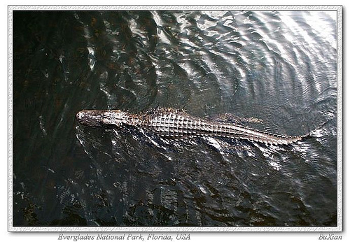 五。大沼泽地国家公园(佛罗里达州; Everglades National Park, Florida) 行前咕歌时, 众多网站异口同声, 皆曰佛罗里达州有两季: 旱季和雨季; 而夏季为雨季, 不宜前往. 有个专家更声称他看到有一个勇士全身裹得严严实实的在大沼泽地国家公园徒步, 否则在蚊虫的袭击下绝难完璧归赵, 全尸而回... ...他们描绘的大沼泽地国家公园真是人间地狱, 还说"知道露营地夏季为什么是免费的了吧?" 吓得俺以为露营地一定是水洼满地, 蚊虫24小时象日本人一样勤奋工作, 而且搞不好随时还有鳄鱼先生前来偷袭一把...得, 咱们还是住旅店去吧. 后来一想, 俺要是去海岛上露营, 岂不就没问题了吗? 咕歌一看, 岛上的营地均已快满, 好不容易才在两个公园找到了两晚的位置 ( 均是最后一个, 还都是只有一晚还空着 ), 赶紧定下. 这是州立公园营地, 在岛链中部, $35 一晚. 如果住在西天岛(Key West)的私立营地, 则要$60---$70 一晚 ! 俺可没那么多银子, 而且俺一贯喜欢荒郊野岭, 在城内住不贯. 由于被专家们吓得不轻, 只安排在大沼泽地国家公园作了半天点水一游. 专家们许诺的蚊子一只也没见着, 这雨季的大沼泽地国家公园看上去也好像还需要抗旱啊. 在佛罗里达的一周中, 尽管每天的天气预报均是"多云间晴, 午后有局部雷雨". 实际上却仅在下午遇到过一次短时雷雨, 晚上又遇到一次. 其余时间均晒得难受. 大沼泽地国家公园。这里鄂鱼众多: