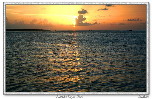 太阳西斜时, 女士们仍意尤未尽, 甚至于就想在大沼泽地国家公园露营. 考虑到所定的营地有淋浴设施, 最后还是决定伴着西阳, 杀奔长岛(Long Key)而去. 那红太阳掉进大西洋(应是墨西哥湾?) 的景色甚为壮观. 直得一提的是, 在大沼泽地国家公园的访客中心, 当俺向他们打听长岛州立公园的电话, 以便查询大门密码时(许多州立公园日落关门), 尽管他们正好发光了州立公园的手册,却仍努力想办法。那位礼品店的老先生费尽周折,终于在一本介绍佛罗里达各处徒步小径的手册中找到了电话,还打过去问到了密码, 让俺感激不已。 夕阳西下: