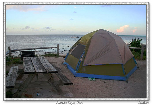 六。佛罗里达岛链 (Florida Keys) 也许译为“佛罗里达群岛 ”更好些?不过,俺只去了由1号公路串起来的那些岛,所以,还是“岛链”。 自从看过施瓦辛格州长大人的“真实谎言” (The True Lie)后,就下定决心要去西天岛(Key West)走一趟。 岛链1号公路北端正在修建高速。 这条200余公里的大道大部分路段限速为55迈(90公里)。从迈阿密到西天岛沿途有数十座大小不一的大桥,其中最大的是“七英里桥”(7 Miles Bridge). 第一晚露营于长岛州立公园(Long Key State Park). 在落日的余辉中赶到营地。这个营地就在海边,几米外就是海滩。当晚海风巨大,尽管俺带的是易拉式帐篷,平时只须几分钟就可以搭好,但此时却连展开都不可能,一展开就被风刮翻了。只好把迎风面的两个脚先钉在沙地上方才得以展开。然后就简单了,往上一提就行。由于风实在太大,帐篷就象随时会被吹飞一样,俺只好把从来不用的那外层雨批上的6条绳子也用上了,以协助固定。此外,又另加了几根尼龙绳帮忙。有个同事曾告诉俺他在北卡海边露营时,帐篷的撑杆就被吹断了。俺可不敢掉以轻心。几经折腾,平时只须几分钟的事干了一个半小时才大功告成。在此过程中,尽管海风巨大,蚊子们照样在勤奋工作,不过俺发现得太晚了一点。。。 殊不知,更大的麻烦还在后头。正当俺沉磬在成功的喜悦中,满身大汗的憧憬冰镇啤酒时,千金大人洗完澡回来,问俺为何星星全不见了? 可不是吗,头顶上刚才还星空灿烂,这会儿却一个也找不着了! 俺暗叫不妙,惶惶然洗澡去也。 待到俺洗完出来,但见远处天边已经电闪雷鸣,热闹非凡。俺观查良久,断定不会袭过来,放心睡觉去。 然而却无法入睡:大风刮得帐篷发出极大声响,再加上远处的雷声,还有1号公路(就几十米外)上的汽车声,声声入耳!而且帐篷中还混进了三只蚊子(这可是空前的,从未发生过)!俺先后三次中断数羊,起来对付蚊子。但这帐篷为大号,12X12X6英尺,尽管俺有一个极亮的发光二极管冲电式灯笼,再加上另一个有两只日光灯的灯笼,还是很难找到。不过军令如山,找不着不得躺下。。。终于在出了三身臭汗后,将这三位倒霉蛋飞行员送上了西天。其后俺好像还听到有蚊子叫,但俺可没敢再声张。。。 未几,雷声越来越近,然后就曝雨倾盆。俺暗暗叫苦:为了偷懒,俺没装另外买的一张防雨布(大风中也没法装),这下惨了!只好祈求上帝/菩萨(土洋结合,增加保险系数)保佑,帐篷别漏。。。雷雨越来越大,闪电越来越强。危机当前,千金大人正好卖弄老师教的:当看到闪电后如果在两秒以上才听到雷声,则闪电尚远,无威胁;否则,赶快逃命吧!于是乎俺羊也不数了,改为数秒。。。其后俺误报警一次,众人惊慌逃入车中;璇因又闷又热又薰,再加上女士们发现俺记数有误,谎报军情,一众人等又返回帐中。 折腾到凌晨4点后,俺才数羊成功(共计666888只)。 长岛州立公园。俺的三折易拉式帐篷久经考验,未漏也未折: