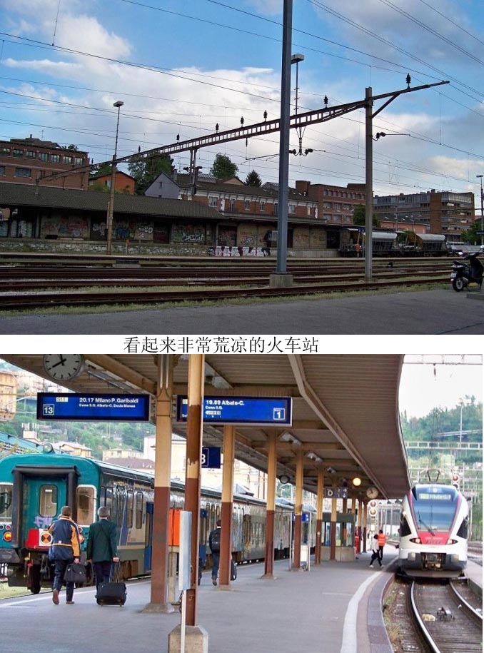 7点48分,上了火车.瑞士的火车很干净,车厢里有电子信息牌,会显示站名. 很快就回到了chiasso,在这里可以直接坐火车回到米兰的Cadorna站,售票处下班了,那个自助的破机器怎么都选不出米兰站来.连车站的工作人员都无奈了,让我们上车找乘务员买,这时一位也要回米兰的女孩又找来一位工作人员,总算找到了买票的页面,车票记得好像是4.8欧.但这破机器只收瑞郎和面值10元的欧元,身上已经没有足够瑞郎和10元面额的欧元了,还好那位女孩帮忙,我们付给她欧元,她帮我们买车票.真曲折.. 上了车很快就睡着了,还好那位女孩叫我们下车,不然一定不知道坐到哪里去了....  (一边是干净的瑞士火车,一边是又脏又旧,满是涂鸦的意大利国铁,鲜明的对比)