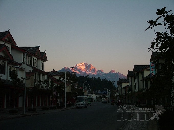 当南方航空公司的飞机飞离桂林,抵达昆明机场那一刻开始,我便开始了那一个传说中的旅程: 徒步虎跳峡、香格里拉、梅里雪山(雨崩)六日深度自助游~~!!传说,去那个地方,是最接近崩溃边缘的旅程~~用接近崩溃的心情去感受大自然的巧夺天工~所以,还有一种说法就是:爱ta,带ta去雨崩;恨ta,也带ta去雨崩…… 晚上21:00,登上事先让阿拉丁买好车票的客车,车上售票的大姐真好,怕我们找不着,还出来接我们,哈哈,透露个好消息,车票可以小小打折哦,各位驴友记住哦~~卧铺车还算舒服,就是味道比较大啊,要有思想准备,要不就飞去丽江;还有就是,一路上卧铺车加油很费时间,我们21:10出发,次日早上7:15才到,原因就是加油太费时间,排队加油: 初到丽江,丽江的晨,很冷,但是不想打车,漫步街头,看见新城区整洁的房屋,背景不错,玉龙雪山,日照玉龙雪山: