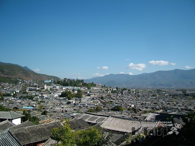 中午12点,走在迷一般的古城内,总算感觉到累了,才想起要放下行李,找地方住,听朋友说,住山上可以看见丽江古城的全景,还可以看见日照玉龙雪山,于是找到古城靠山上的一家客栈,叫做“观景台客栈”,由于是淡季,跟老板谈了一下价格,最后以70元成交,呵呵,便宜哦。写下行囊,观赏一下美景,灰色的瓦房鳞次栉比,蔚为壮观,远处突兀森郁,白雪嶙峋的玉龙雪山:
