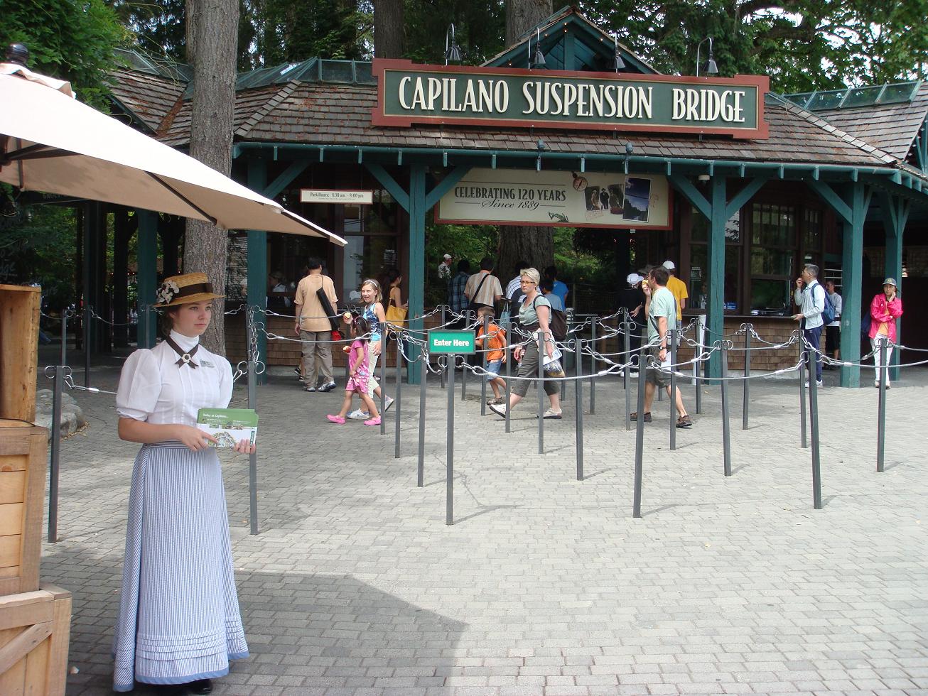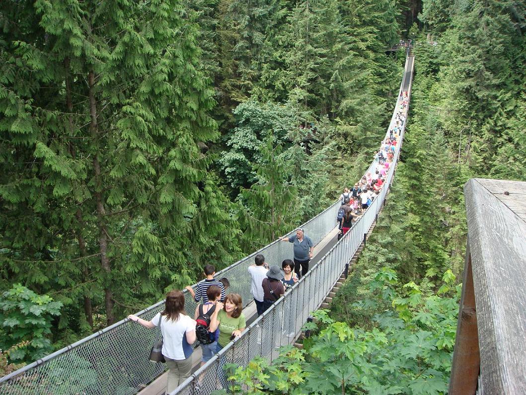 在北美的自行车道上,人们约定俗成地从左边超车。超车时还会说一声:“左边超车!(On your left!)” 到了温哥华,还一定要去逛逛斯坦利公园北面的吊桥公园(Capilano Suspension Bridge)。看看温哥华人是怎样让城市公园与大自然有机结合到一起的。在温哥华的第二天,我们又去了吊桥公园。