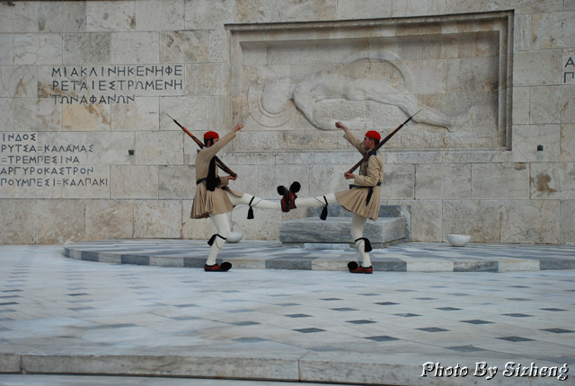 (图太多,只好分段发) 从卫城下来后,就来到了亚戈拉广场。我们先到阿塔罗斯柱廊里面欣赏了一下雕塑艺术,然后又到对面的赫夫斯托斯神殿转了一下,在那还看到了两只乌龟,特别有趣。已经是下午3点半了,肚子有些饿,我们便找了一家咖啡馆坐下,点了一盘牛肉饭、一盘沙拉还有一个草莓冰激凌美美的吃了一顿,然后继续赶路。从咖啡馆回宪法广场有两站地的路程,为了节省体力,我们决定还是坐地铁回去。从宪法广场上来便是著名的无名英雄纪念堂。每隔一个正点就会有换岗仪式,许多游客都等在那里欣赏。