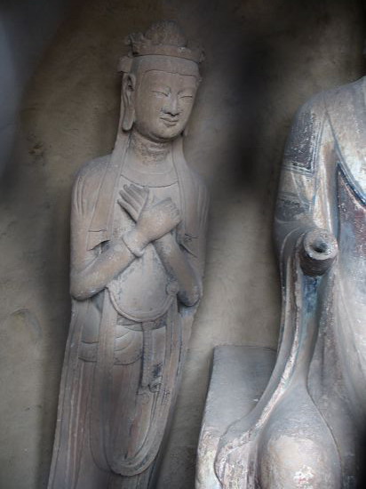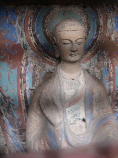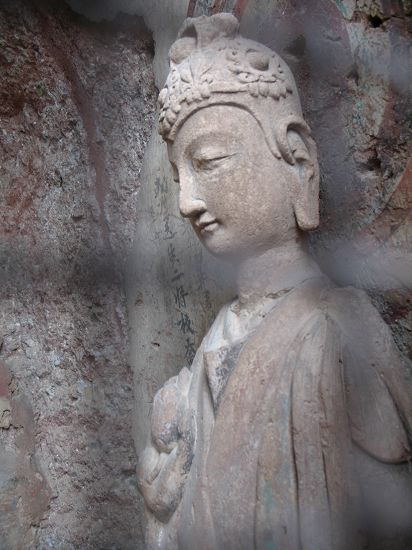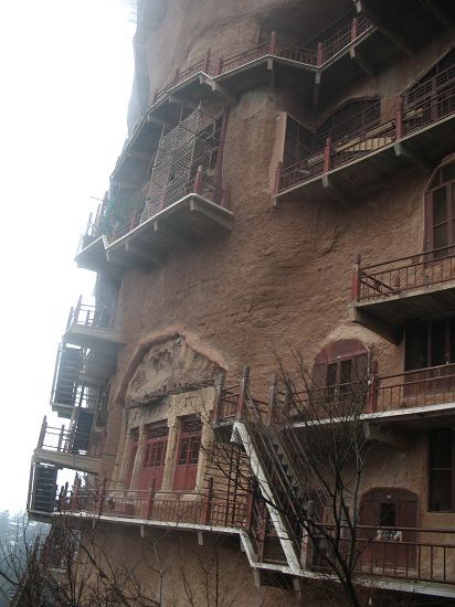 09.3.27,下火车存包后马路对面即是往麦积的公交。天微雨,美滋滋地等着麦积烟雨的景观,谁知烟雨大发了些,成了云里雾里,不见麦积真面。 舍远求近,在雨中,后来是雪中,寒寒地沿麦积栈道两个来回。尽管相当多的洞窟特别是精品窟,路被封住、门被锁上,能看到的洞窟造像基本被铁丝网在窟内,窟深些的暗无天日,几无所见。但仅从能看到的石窟造像看,已是很美,或者说极喜欢,喜出望外。清秀的造型,且颇有力度,魏晋风度?造像体量虽多不大,但其精美觉得在云岗、龙门之上。缘其有塑像的因素,且保存较好? 可以直接看到的造像:两组大窟13和98窟及中七佛阁(9窟),散花楼(4)的飞天壁画、天龙八部浮塑及力士造像,牛儿堂(5窟)外的牛儿天王。但这些似反不及小窟内的震撼。 服务已在努力的规范,能感觉到,但仍没到位。在门票上、在服务中心都无导游线路图,只在墙壁上有绘,然无一图在手,终是无数。第一遍只是尽可能的走到看到拍到,但回过来看线路图觉着还是漏下了好些精典。想请导游带着走一遭,几个讲解的小女孩说不值,一个人也得花50也讲不了什么,不如去买本书,并很热心地带去有书的摊位上。书并不很切,上面的图也过简,后来总算翻出一张导游图册。于是拿着走第二遍,书拿在手上做标记、图留着回来拍照,一个个的对照去,哪些没看到位,哪些看不到。结果精品多是不让看而非没看!那些算是特窟,收费,几个窟,每次得3、400。 尽管如此,隔着铁网,看到的、拍下的已觉得很美了。但,还有更多更美的呢,不甘,何日再来? 突然发现,除37、146少数几个外,其余的头部有断痕,为什么?是后塑的?什么时间?是旧时模压头?  (栈道)