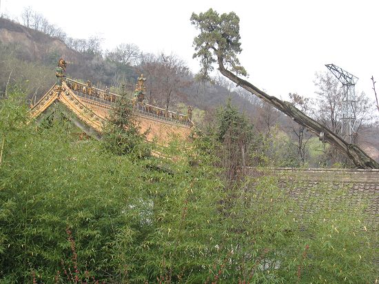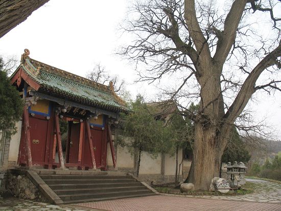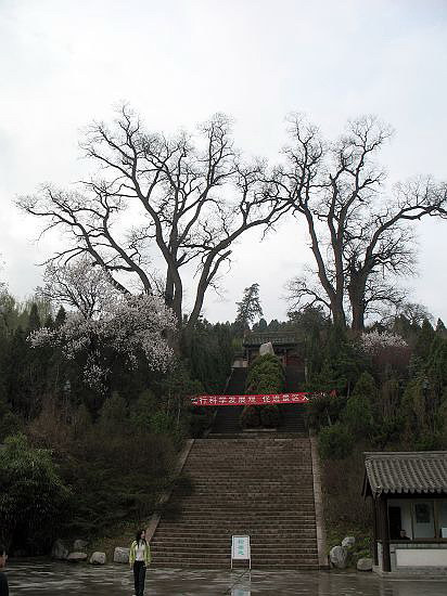 09.3.28 老城区(秦州区),看市内古迹。 天水真古城,尽管战事不断,古建仍随处可见。除古建内,即便行道中,也可常见突兀着的很有些年头的古树。一天里,访南郭寺、玉泉观、后街清真寺、伏羲庙、孔庙、天水台子清真寺、万寿宫,还真不少。 城南边的小山上,有个古老的寺庙--南郭寺,然而,树更老。两株倚侧的古柏,说是在2300岁以上,那可是东周物了。那时的此地,又是个什么的所在?当然,也可能是汉时,在此构某建筑,移了两棵柏树过来。到了唐朝,老杜避安史之乱,贫病秦州3月,留诗百首,有道:“山头南郭寺,水号北流泉。老树空庭得,清渠一邑传。” 老树,可是我们所同见?当然,即便树犹此树,然亦非彼树了。 东院(?)内关圣殿前,居然见两大丛茂盛的牡丹,百年以上了吧。真陇上江南! 山门前两唐槐,回首望去,高阶上,好气势!