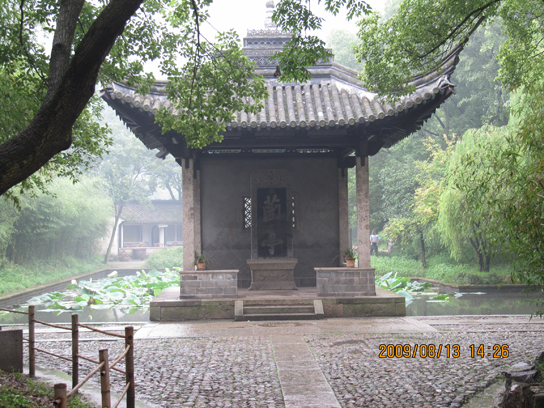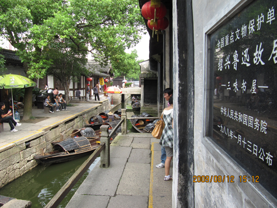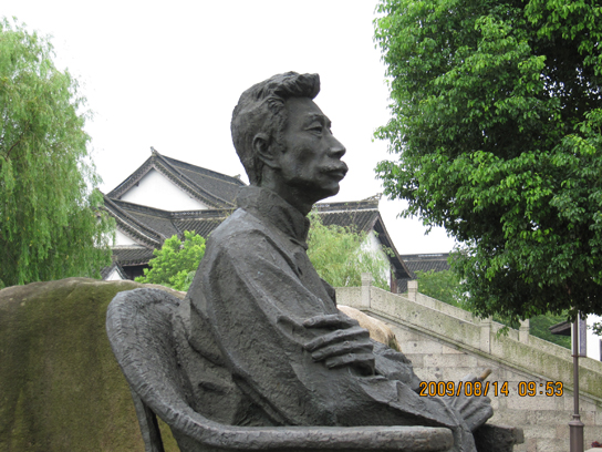 街口,还是那个“丁字街口”,牌楼,还是那个“古轩亭口”的牌楼。 不同的是,街口中央,站着一个有点古旧的纪念碑,上书“秋瑾烈士纪念碑”七个鎏金大字,街口的尽头,站着秋瑾的塑像,通身皆白,身后的墙上有“巾帼英雄”四个大字(孙中山的手迹)。 车水马龙,几至拥塞,今日之“丁字街口”也! 我是12号来的绍兴,今日(15号)下午就要回沪了。 1907年7月15日 -- 1962年秋冬之交 -- 2009年8月15日。 – 三点构成一线; 秋瑾塑像 -- 纪念碑 --“古轩亭口”。-- 三点又构成一线! 时空交错点,百感交集地。 汽车、助动车、三轮车、身着鲜艳夏装的本地人和外地客,川流不息于“丁字街口”。你想到纪念碑前读读碑文,或献上一小束花,也要冒着交通事故的危险。 于是,我来到了“古轩亭口”的牌楼下。 远远地,久久地,我向纪念碑和秋瑾的塑像致注目礼。 静静地,呆呆地,我一一盘点四天来走访的名人旧地。 鲁迅故里、周恩来祖居、沈园、兰亭、蔡元培故居、青藤书屋、大通学堂、秋瑾故居、徐锡麟故居和大禹陵…… 。 绍兴四日,让我闻足了乡土味儿; 绍兴四日,你的名人旧地,又让我嗅足了你的名人味儿! -- 有哪几样东西,今天我们还能找到?(母亲问儿子) -- 碧绿的菜畦、泥墙根、皂荚树,还有水井……。 -- 水井是有,但是,缺了啥? -- 缺了光滑的石井栏! -- 对!你再读一遍。 -- 不必说碧绿的菜畦,光滑的石井栏,高大的皂荚树,紫红的桑椹;也不必说鸣蝉在树叶里长吟,肥胖的黄蜂伏在菜花上,轻捷的叫天子(云雀)忽然从草间直窜向云霄里去了。单是周围的短短的泥墙根一带,就有无限趣味。(儿子的普通话很标准,他大声朗读着,尽管我就站在他们母子旁) 在百草园的“泥墙根”后面的大墙上,镌刻着《从三味书屋到百草园》的全文(鲁迅手迹),母亲带着儿子,站立在大墙前,指指点点,说说笑笑。 进入老境,身居上海的鲁迅,夕拾朝花,写下这篇不朽的文章。童趣,及先生对故乡的眷念,对生活的热爱,跃然纸上。 绍兴鲁迅纪念馆,建造三味书屋的斜对面。现代、豪华、气派,与周围的建筑,反差巨大,仔细浏览,甚为失望,因为展览内容与上海鲁迅公园内的纪念馆几无差异,而很少绍兴的乡土味儿。 不过,我还是久久伫立于1903年鲁迅在日本求学时写了《自题小像》前。 灵台无计逃神矢,风雨如磐阁故园。 寄意寒星荃不察,我以我血荐轩辕。 “我以我血荐轩辕”一句,让我联想到 -- 4年之后的“古轩亭口”。 绍兴名人多侠气! 王羲之 (321--379),山东琅琊人,一条山东大汉,旅居绍兴,绍兴的一方水土,也滋养了他的气质。 公元353年春三月初三(永和九年),兰亭最应感谢的一个日子。 -- 从此,兰亭出名了。同时,中国的书法界、文学界、或曰中国文人,也都应该记住这个日子。 时值初春,万物复苏。 这一日,会稽内史王羲之偕亲朋谢安、孙绰等42人,在兰亭修禊(“修禊”,乃古代除灾祈福仪式,古人认为春日易生疾病,于水上洗濯,可防病疗病)后,玩了一场“曲水流觞”的游戏,不料,此游戏竟成千古佳话,这一雅俗,留传至今。 这场游戏的实质便是再寻常不过的饮酒赋诗而已。 在兰亭一条清溪两旁,王羲之等42人席地而坐,将盛了酒的觞小心翼翼地飘浮在溪水中,酒觞则在春天的溪流中顺流而下,弯弯曲曲,飘飘荡荡,酒觞在谁的面前打转或停下,谁就得即兴赋诗并饮酒。结果,11人各成诗两篇,15人各成诗一篇,16人作不出诗,各罚酒三觥(相当于现在的一斤半)黄酒。