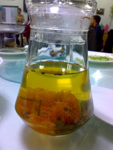 这可不是一般的菊花茶唷~~看着这么黄澄澄的小菊花在壶里也绽放着,是不是觉得很可爱呀?姑且不论他坝上龙井的美誉(这个...倒是有点言过其实啦,不过草原地方茶本来就难得,将就一下啰...ccc),光这个金莲茶也是有典故滴~~