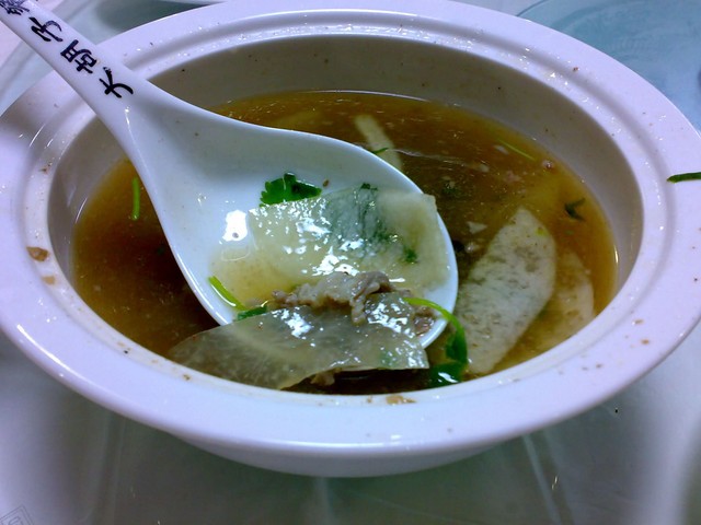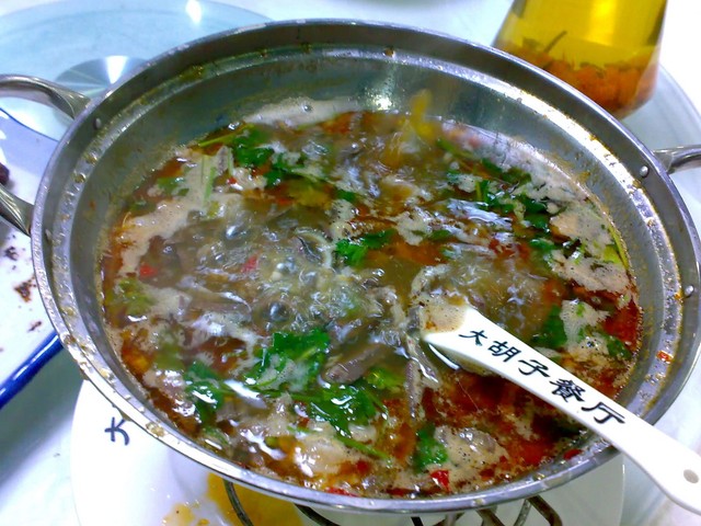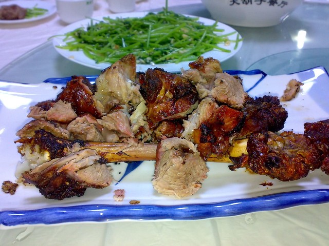 美食三:锅仔羊杂,,羊的下水,不过弄的是香辣口味,吃起来香而不辣,原本以为下水会被弄得干干涩涩的,结果吃起来口感相当滑嫩,一个吃起来像是羊腰的部分,嫩的香的差点我跟老婆都咬到舌头,再配上大大口的白饭,呼~~~~~赞啦!老板,再来一碗白饭嘿~~ (PS. 这道菜还有没有历史典故?...老是吃饭时要我讲历史,还给不给人吃饭吶?还不给俺斟杯金莲茶来!) 美食四:羊肉冬瓜汤,吃晚餐前,让我们赶上了高原上的滂沱大雨,从宾馆走到餐厅才不到五分钟路,鞋子裤管早就淋湿,原本就计划好吃个全羊肉餐,所幸连汤都要跟羊肉搭上边!结果这碗汤出奇的好喝。甫一入口,好像有沙茶味道,但是在大陆偏偏没有沙茶这号人物的存在,不知道是用了什么秘方炖出来的好味道。冬瓜削成了片状,估计品种跟我们台湾常吃的不同,吃起来有点脆,不是软烂的口感,配上羊肉片,以及里面的葱、姜,一口下肚,全身马上暖和起来~~呼!! 还好得稍微克制一下自己的冲动,不然光喝汤就饱,主菜都没得吃了! 美食五:烤羊腿。这不必多做介绍了吧,也不需要增添啥历史典故了,大家都熟悉的烤羊腿!不过这家大胡子饭店的确有点功力,怎说呢?烤羊腿每家店都有,就是这家与人不同。羊皮烤的酥脆,用的又不是孜然这种香料,但是吃起来就是一整个香气十足,烤的入味又不老,光吃皮就觉得值回票价!