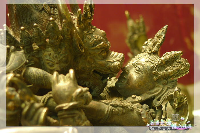 昨晚被楼下车来车往吵得几乎一晚没睡,凌晨 5 点,我叫醒前台小姐,让她帮我换房,答曰:没空房了,要换不临街的要等到中午 12 点以后。我几乎是咬牙切齿地告诉她中午只要有不临街的房空出来,我就要了,套房也要!然后上楼洗漱…… 吃完早餐,准备去省博和藏博逛逛,顺便把装备补全一下。这宾馆唯一让我宽慰的就是交通还算方便,楼下就有 31 路车,直接坐到新宁广场就到了青海省博。青海省博新馆就在新宁广场正中,是非常有气势的古典建筑,本来准备排长队的我惊奇地发现,这里的游客非常少,完全不用等就直接进去了,对比湖南省博的排队 2 小时还看不到头,这里实在是太清净了,后来才知道青海省博有很大一部分文物没有展出,也许这就是人少的原因吧! 走进省博,本想请个导游,被告知在二楼请,上了二楼只见一位卖东西的大姐,说每件东西都有说明,自己看看就行了,真正的好东西都没摆出来,如果一定要请要花 40 元,她去找人。我犹豫了一下,决定先进去看看再说。事实证明,无论在任何博物馆,请导游讲解都是必要的,我在转藏毯厅的时候,看了半天没看出啥名堂来,看到有两位深圳的大姐请了一位导游,讲解的那叫一个细致!羡慕之余立刻上前询问在哪里还能请到导游,美女导游看着我笑了,说今天其他导游都去开会了,省博就只剩她一个了。我只好厚着脸皮要求一起听,那两位大姐很大方地答应了,好人呀!美女导游姓薛,人美声美,还非常有耐心,两位大姐拍照的时候她就在一边等着,没有催过一次。 省博的文物其实不少,分藏毯展区、雕像展区、唐卡展区和环湖赛图片展区。这里很多精美的雕像都非常值得一看,尤其是那些神态各异的佛像,和汉传佛像不同,更倾向印度或尼泊尔的造像风格,有神态宁和的寂静像,也有神态狰狞的忿怒像。据说诸佛菩萨对于信仰佛法的众生,就用寂静像度他,对于不信仰佛法的众生,就用忿怒像度他,对于极刚强不讲理之众生,就用大忿怒像度他,这就是菩萨普度众生的道理。在青海的雕塑里佛的忿怒像是明显多于寂静像的,因为这里喇嘛大多修习密宗。雕像展区还有比较少见的双修佛,其中一座黄铜大威德金刚立像尤其精美,大威德金刚是文殊菩萨的忿怒像,金刚九面三十四臂十六腿,硕大的水牛头,双目怒瞠,鼻翼大张,充满威猛无敌的气概。他裸身拥抱璎珞满身的露漩佛母,手持钺刀、血碗等法器,多臂成扇形展开,脚下踏着八兽、八禽、八天王、八女明王。金刚整体造型严谨,做工一丝不苟,显示出造像师精湛的工艺水平。 唐卡展区分国唐和止唐,其中一副用金箔绘的黑唐,连菩萨的发丝和璎珞的丝涤都绘制得一清二楚,总之,唐卡那工到细致的笔法和蜿蜒流畅的线条给我留下了深刻的印象。据说,僧人或艺人在唐卡上绘制佛像,身体比例都必须按照自古流传下来的严格规定——度量经,在我看来这本经书就是一本唐卡绘画教材,它把所有佛像、神兽的比例都用经纬线进行划分,涵盖内容极其全面。 出了省博就打电话给青海户外联盟的多情,到他店里买了冲锋衣和抓绒睡袋,他知道我 20 号要包车去大武久治和玉树,还很热心的帮我联系到了网上挺有名的梁师傅,我今天碰到的都是好心人哪 >o< ! 藏博的全称是青海藏医药文化博物馆,在生物园区,人和车都比较少,我去的时候正在下雨,馆外几乎没人,馆内参观的人倒是比省博要多些。在售票处花 80 元请了个藏族小姑娘做导游,讲解时间是一个半小时,可能是我看得比较细,所以感觉时间还是太紧张了。这里有上了吉尼斯记录的世界上最长的唐卡,它几乎把藏传佛教故事和藏区著名的历史人物都囊括进去了,简直是图画版的藏族文化历史书!整张唐卡上既有传统画法也有油画技法,还有面部用油画身体线描平涂的,据说是 400 多人花三年时间才完成,但唐卡整体色彩和谐统一,无论使用哪种技法,笔触全部都异常细致,丝毫没有违和感。这也体现了唐卡绘师们超强的责任感和对佛教的虔诚。 出了藏博打的回宾馆,如愿换到了不临街的套房,就算房间还是有味道我也忍了,见到了同房间来自北京的黄姓美女,今后的 8 天要一直住一起了,她看起来是很好相处的人。晚上欢迎晚宴时,天空中挂起了彩虹,希望是个好兆头!