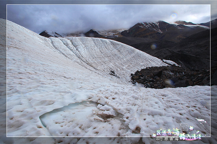 我们继续往前,一路走一路聊刚才那只机灵旱獭,梁师傅却突然停车了,原来车前有一只被车撞死的旱獭,大概刚被撞不久,地上那鲜红的血液还没有完全凝固。因为刚才看过它的同类那可爱小模样,再看到这只,感觉格外可怜,不禁产生出要不要挖个坑把它埋掉的念头。老赵拉着我说不用了,并指了指天上,我抬头一看,原来是一只大鵟正在头顶盘旋,看来这只藏族神山上意外逝去的生命还是能享受到藏族传统葬仪——天葬。在短短的半个小时,我们看到了一个生命的轮回,祝愿它的灵魂能被带回天上,重归山神的怀抱。 说起大鵟,我们一路上的确是碰到不少,既有幼鸟也有成鸟,大概是食物丰富,这里的大型猛禽非常多,我们看到了世界上体形最大、长着黑胡子红眼睛的胡兀鹫,还看到了高山秃鹫排队爬山坡。 越往里走,峡谷里的景色越迷人,绕山的溪流越来越清澈,水边是风化如叠瓦的悬崖,上面开着一丛丛艳丽的紫红马先蒿,还有很多形态奇异的松柏参差其中,有的形如羚羊挂角、有的状如牦牛饮水,还有的竟如骏马奔腾。对于看了 10 多天的纯粹草原的我来说,看见这些犹如盆景造型的山、水、花、树,真是倍感亲切。 根据老赵的指示,我们找到了一个流着红如鲜血的泉水的泉眼,据说这个血泉流出的水味道很难喝,但当地藏民都用它来治疗胃病,效果很神奇,所以泉边散放着很多感谢泉神的哈达。因为当时在下雨,我的胃也挺舒服,所以我也没有亲自去尝尝是否真的不好喝了。我很浅薄地想,这水里面大概是含有不少矿物元素,比如铁、锰之类,水才会如此鲜红吧! 血泉不远,就是白泉,白泉水量比血泉大,因为这里的流出的水是奶白色的故得此名。这白色泉水也是治咳嗽的良药,据说味道比血泉好些。 下午三点,我终于看到了白云环绕的阿尼玛卿, 10 多座雪峰在阳光下犹如白莲一般在青翠的山坡上盛开。站在这仿佛从天境跌落人间的长轴画卷面前,我感觉自己是俯卧在母亲膝头的孩子,仰视着她那可亲可近又博大恢弘的容颜。任何的华丽辞藻在她的面前都显得太过矫情和苍白,震撼之余,我终于可以理解为什么见过阿尼玛卿的人无不为之倾倒。 为了更近地感受到雪山,我们加快速度往冰川开去,这里已经是海拔近 5000 米了,一路上我们看见不少青藏高原特有的藏药,有“高原郁金香”之称的全缘总状绿绒蒿,有蓝紫大花的多刺绿绒蒿,还有开满白花的藓状雪灵芝……最让我们高兴的是晚餐的时候,老赵在草甸上发现了一片野生黄蘑菇,让我们好好体验了一把捡蘑菇的乐趣。 下午六点,我们经过近半个小时小心翼翼地攀爬,翻过两座碎石山,终于站在了冰川上!阳光不时从云缝中射到冰面上,在华丽的冰雪反射光中,我第一次发现,原来冰川上冰的色彩并不只有白色,大部分的冰面上有着犹如年轮一般微黄或微褐的波浪状纹路。有的冰面上还有着明显的裂隙,这些大概就是岁月在冰川上留下的脚印吧! 正在我们不停地按动快门的时候,突然听到哗啦一声,我们向左下方一看,原来是一块很大的冰面融化下滑,砸在碎石滩上裂成很多块。在冰与石的交界线上,冰川以肉眼看得见的速度在融化,雪水如丝如线不断地从冰缘流下。看着这一幕,虽然知道冰雪在夏天融化是很正常的现象,但还是让我联想到了全球的温室效应,联想到了人类活动带给大自然的强大破坏,联想到了近几年阿尼玛卿的主峰因温室效应雪崩,我突然不好意思继续呆在这洁净的冰面上了。于是,我们收起脚架和相机,走下冰川,站在碎石滩上默默祝愿这片美丽可亲的冰川能永远存在。