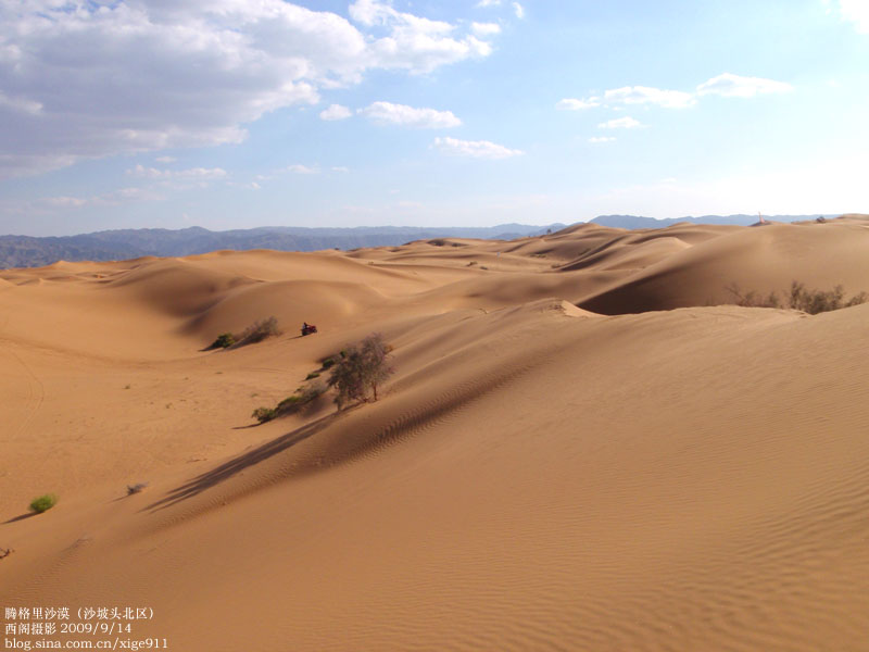 毕竟南区仅有河岸边的大沙山而已,看不到连绵不绝的沙海景观,北区才能一睹腾格里沙漠的真容。 进入北区,向左走,可以沿沙漠栈道步行进入沙漠里的海市蜃楼营地;向右走,可以乘景区电瓶车抵达海市蜃楼营地。 我选择了沙滩摩托,看起来似乎不难驾驭,其实也的确不难驾驭,但很惊险刺激!出发的路段较平坦,随后就给足油门冲上沙山顶,这时,惊险场面来了!从高高的沙山顶俯冲下去,同时继续给足油门,并伴随着大转弯。耳旁呼呼风声,感觉一侧的后轮似乎都悬空了。真刺激!这时感到坐在身旁的副驾驶是必要的,若没有他的指导,初次驾驶沙滩摩托的游客很可能爬坡到一半就上不去了,转弯时也容易翻车,下坡时就更不敢加油俯冲了,不但少了刺激性,没有俯冲的惯性,随后再爬坡可就难了。 刚刚享受3分钟快感,摩托开到了本项目的尽头,要转回去了。我跟副驾驶说明,我要在此拍照一番,请他空车回去,20分钟后再来接我。 此时已是傍晚5点多钟了,可日头没有落下来的意思,原来宁夏比北京偏西,时差近40分钟,长河落日要待晚上6点多钟呢。驼场已经空了,既没游人、也没骆驼,我有点失望,看来不得不原路走出去了。随口问了声驼场留守的人,嘿嘿,居然可以用对讲机调骆驼前来接我。30元,骑上骆驼,一摇一摆地稳步走在沙漠里,10多分钟,从海市蜃楼营地,回到北区门口附近的驼场。 此次沙漠游,虽然比我想象中的沙漠要逊色,但还是玩得很开心。 出了北区门,打的士回市内,途中看见有个“石空寺大佛”景点,看起来不太大,半山腰上建个佛寺,像个小悬空寺。因时间不多,便没去那里。直接回到市内的高庙保安寺。 高庙位于中卫市区城北。建在接连城墙的高台上(包括高台下的保安寺)。始建于600多年前的明永乐年间,经历代增建 高庙是一座三教合一的寺庙,很奇特。庙的砖雕牌坊上有一副对联:“儒释道之度我度他皆从这里”;“天地人之自造自化尽在此间”。横批是:“无上法桥”。庙里供奉不仅有佛、菩萨,还有玉皇、圣母、文昌、关公。佛、道、儒三教的偶像,济济一堂。 登上高庙的最高层,又是一番景象。古人咏颂此景: “芦花飞雪涨晴漪,烟雨冥檬望益奇。点点白鸥深处浴,扁舟遥动五湖思。” 那简直是一幅壮丽而又清淡的巨幅国画。极目云天,泼黛浮蓝;大漠、绿洲、黄河、长城尽收眼底。近处,云蒸霞蔚,似乎赤城霞、峨媚雪、巫山云、潇湘雨、钱塘潮。庐山瀑均生于此,催人遐思,感慨万千。这时,从远处飘来的瀚海驼铃又那么深沉悦耳,游人犹如沉浸在诗中画内。 夕阳里的高庙显得深邃、幽静,上下游览一圈,发现琉璃飞檐和古瓦屋顶尤其耐看,精美的砖雕在斜阳里线条分明,美轮美奂。 别了高庙,就去了鼓楼旁的逸兴大酒店,把衣服,背包全面清理一遍。又泡在浴盆里舒舒服服地洗了个热水澡。洗毕放完水后,澡盆底竟有一层细沙,哈哈。 为了这次沙漠拍照,我特意买了奥林巴斯u8000防水相机。回来后,把相机泡在水里涤荡了一番,洗出沙尘,相机一切正常。想当年,我用普通相机在敦煌鸣沙山和昌黎翡翠岛沙漠拍照后,每当相机调焦时,就能听到镜头机构与沙尘的摩擦声。 一宿好觉,早餐是宾馆免费自助餐。现场制做的拉面味道真是不错!在兰州的空缺,竟在中卫补齐了。早餐后,乘高速大巴去银川。 秋高气爽,阳光明媚。刚出中卫的地方有一处塞上江南的景观,非常漂亮!可惜车子一掠而过,没来得及欣赏和拍照。要是事先知道有这么个好地方,一定专程来游览拍照。 出了中卫,奔向银川的途中,有几段路旁的景观竟然与火星像似,又有几处很象阿富汗山地,看起来藏几个拉登不成问题。要是自驾游,沿途几处荒凉景观倒是别处难得拍到的。