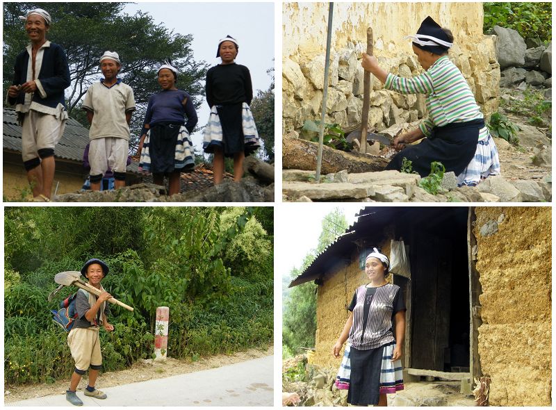 男白裤瑶们个头都很矮,笑眯眯的,温和友善。有两个主动和我打招呼,还握了手。他们的衣裳远没有盛装照片上那么光鲜艳丽,但那笑容绝对给了远来的客人真诚和温暖。他们忙着修房的活计,谁家盖房政府都会补贴一万多块钱,村民们义务帮忙。 女白裤瑶们有的羞涩,有的健谈(用当地的一种话)一个两个女孩的妈在家门口堆了几袋政府给的大米,看来她一时半会吃不完了。她很不满地说自己被结扎了,不能再生娃娃了。(这是一个只有三万人的瑶族分支。)一个坐在门槛上的女孩在绣腰带上的花,我看了一会,实在是太费劲了,恐怕得个把月才能完工,然而在这个简单慢节奏的山村里,功夫还能用来干什么呢?