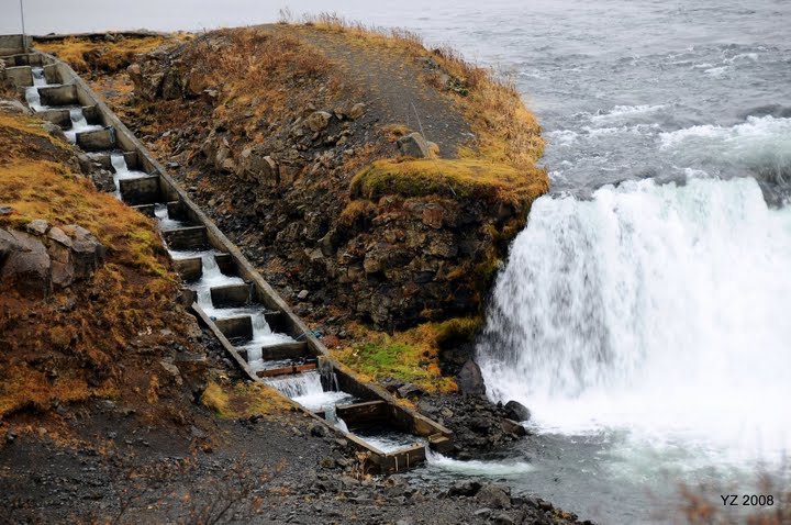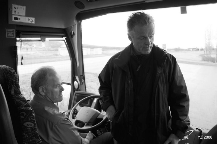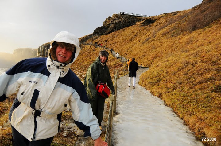 我们接触的最多的就数旅游大巴(GREYLINE,S GOLD CIRCLE)的导游和司机了,就是照片里这俩老头。观赏美女的机会微乎其微。别说同事中的两个单身贵族,连我这女游客都大失所望。不过一头银发的导游大叔讲解得相当不错,常带点儿黑色幽默。 车行半日,才找到这点儿冰,一点儿冰天雪地的感觉也没有。这冰岛名不副实啊。导游说,"我们冰岛是欧洲最暖和的首都,最冷的时候也就零下十度。" 那两天气温和斯达湾格差不多,11月上旬6度左右。挪威同事自豪地说,想当初我们的Ingólfur Arnarson在847年最早到冰岛定居时,故意起了这么个冷冰冰的名字吓唬人,以便据为己有。 午饭前,到了gullfosse, 直译就是金瀑布。 瀑布边上结了一层厚厚的冰,小路变成了冰道。导游大叔停车前一再叮嘱我们千万注意安全,不要掉下水去,"不然,我要做好多paperwork,太麻烦了!" 为了不给导游大叔添麻烦,我们一个人都没掉下去,包括这几位游客,瞧,多小心啊。