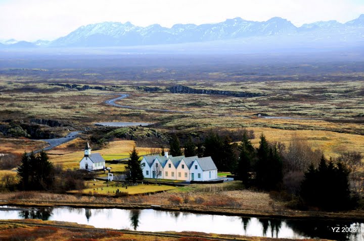 那是专为野生三文鱼跳”龙门” 修的,原来瀑布太高,鱼儿们自己跳不上去。导游大叔说,“冰岛人民多体贴鱼啊!主要是我们冰岛的三文鱼太好吃了!” 晚餐时我们在餐厅里专门尝了尝,也没觉出特殊来,“主要是我们挪威的鱼太好吃了!”同事模仿导游的口气说, 大家会心地笑起来。 位于冰岛西南部,坐在北美和欧洲大陆架的交界处,是历史上历时最长的国会场所(930 到1798年),也是冰岛的重要聚会场所,1940年冰岛人就是在这里宣布脱离丹麦王国,成立冰岛共和国。这里是冰岛唯一的列入UNESCO世界遗产名单的一处名胜古迹。
