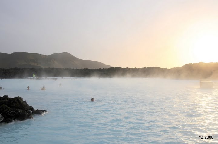 冰岛的树少,好不容易见到一片小树林。导游出了一道题:如果你在冰岛的树林里迷失了该怎么办?旅游们叽叽喳喳说啥的都有。导游说,都不对,答案是,站起来!一车人哄然大笑。我这人迟钝,居然想了一会儿才明白他在自嘲冰岛的树矮。 冰岛的火山多,地震也多。导游刚上车时就对大家说,你们今天要是运气好的话,说不定会赶上一次地震,当然,火山爆发就更精彩了!结果我们的运气太好,一点儿都动静都没赶上。 由于金融危机,冰岛国家破产,新闻里成天喧喧嚷嚷的,好像冰岛人民已经上顿不接下顿了。我们出发之前,凯瑞和坦尼雅劝我带些儿干粮预防万一,“电视里说他们的商店里都空了!没人愿意给他们贷款进货。” 我犹豫再三,带方便面?那岂不是又回到了寒酸的学生时代?最后装了两包巧克力粉。其实我平常压根就不爱喝那玩意儿,可架不住它能充饥止渴还补充能量。结果,又原分不动地带回家了。 第一天晚上我们是在一家VIKING饭店吃的仿古文餐,开胃品是干鱼片和鲨鱼干。鲨鱼干看上去像是切成小块的奶酪,上面插着牙签。我们一组六个人中,四个男人勇敢地当了先锋,我以中国人没啥不敢吃的大无畏精神也吞下去了一小块,美女Katrina最后在大家的威逼下,把鲨鱼干放进嘴里,卡在了嗓子眼里,灌了大半杯啤酒才冲了下去。其它几道菜说是按Viking菜谱做的,好像跟今天的西餐没多大区别。 第二天晚上,大家去了一家叫Pearlen的旋转餐厅享受了一次带星级的自助餐,麋鹿肉排,野鸟肉,鸡鸭鱼虾琳琅满目,再加上旋转的夜景配红葡萄酒,让我很快花了眼,到最后都不知道自己到底吃了哪些珍馐。 因此本人证明,冰岛的游客一点儿都没饿着,相反地,我们个个撑得要命,饭后从六楼一步一顿地走下了楼梯,一来帮助消化,二来不用担心把电梯压塌了。 由于金融危机的影响,向来以天价著称的冰岛物价大跌特跌,汇率一降再降,冰岛一下子变成了旅游购物的天堂。 不过,我最留恋的还是在蓝湖泡温泉浴,那个舒服啊,怎一个爽字了得!