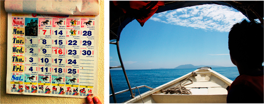 到达哥打巴鲁,只能打车去码头(传说中有公交,但路途遥远,强烈建议把这个费用留出来,哪怕是跟人拼车都好!)。Lonely Planet的信息估计是有点年头了,打车的钱已经变成了双倍多:78RM,幸好偶们是四个人。 注:在跟Taxi管理站交谈时知道,如果订taxi加去岛上的船票的话, taxi 可以只要RM60。但是,回来的时候,我估计hotel是不会管你的,所以自己想好噢! 热带湿润的气候感觉很舒服。与柬埔寨到处都是椰子树、吊脚楼、荷花不同。这里房子要好得多,漂亮得多。而且,一路上看到的都是包着头巾的穆斯林小MM。路上经过的大约是他们的女校,校服超漂亮的说:一种是全身的紫色,从头到脚是逐层渐变;一种是蓝白搭配,头巾和外挂都是白色,最下面露出的里裙是蓝色。 睡得七荤八素的, 到了码头,在我们订的cocohut旅店的接待处,交了剩下的一半房费(注意:可以刷卡,但要交3%的手续费)。顺便去附近的中国小饭店,吃了中饭。Gaoxia二人对炒面赞不绝口。我倒是觉得老板娘头上戴的粉色发卡挺可爱。 最逗的是墙上的日历。首先,第一感觉是比咱们保留的传统老祖宗的糟粕比较多,第二,注意看下方的12 生肖。前十一个都是图案,除了最后一个居然是个中国文字。嘻嘻,估计是在穆斯里国家里象形文字比较含蓄吧。 阳光真好啊,船还没到,心里暗暗着急,这可不要错过了大好天气。给我们领路的华人小MM还感谢我们有耐心,不象另外4个大约马来本地人那么心急吵吵。船来了~赶紧上船就座,船老大开足马力,哧溜的向外海始去。海水的颜色由黄逐渐变蓝,越来越清澈。而船的运动也发生了质的改变。不再是水平线上直线前进,而是迎着海浪蹦着向前。船每跳跃一下,我们就欢快的大叫。不知对面的马来人有啥感受。所以,RM70的来回船票是很值得,就当北戴河坐快艇了吧,这可是20海里阿!