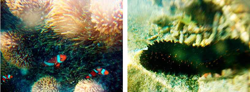 等从林子里走出来,走过第一片沙滩时,雨停了。此时展现在我们面前的是一片不满珊瑚的海湾。走进水里没有两米远,我们惊讶地发现了一个岩石下有好几个海葵, 而且每个海葵里面都住了一窝尼莫~!!!这一巨大发现,真让是让人美坏了。俺盯着尼莫们在海葵里穿来穿去,傻傻的看了半响。Agou三继续往外发掘各种海参、贝壳、小鱼还有尼莫。我站在附近的岩石上,用小相机自拍几个,嘿嘿。
