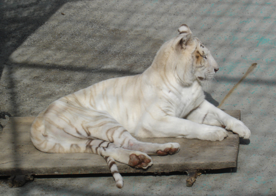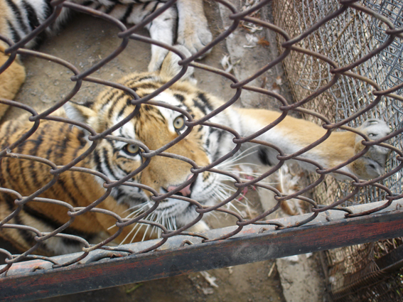 10月6日 旅行第三天 一早起来,吃完早点直奔哈尔滨的东北虎林园。坐车跨过松花江,江面风平浪静,早晨的阳光虽然充足却不耀眼,照在江面上金波灿灿,江岸边的树木印证着秋天的美丽,红色、黄色、绿色混杂在一起,恍惚间会觉得到了另外一个国度。心中不禁感叹,哈尔滨,真的很美丽。 东北虎林园,门票65元/人。据说里面的老虎、狮子之类的一共有两三百只。两三百只?没有多少概念,但当我真的看到一群群老虎在我眼前走来走去的时候,只能用“刺激”两个词来形容了,呵呵。 游客坐在焊满铁条的中巴车上,就跟坐在笼子里一样。我们这辆车,除了几个中国人,其他的都是俄国鬼子。一个中国导游,用充满东北味儿的俄语在跟他们交流。俄语我虽然听不懂,但导游的语音语调让我倍感亲切,呵呵。 啥也不说了,上虎图吧。可惜汽车开着,再加上外面有铁窗,所以照的不怎么样。我拍的基本都算不上是猛虎,净拍了可爱版了。