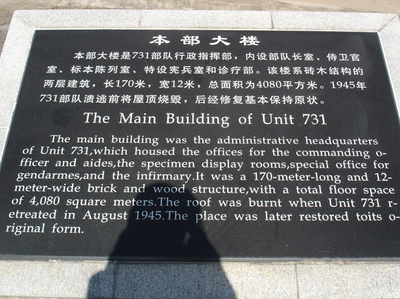 10月7日 旅游第四天 今天的景点是个非常严肃的地方,这个地方我们任何人都不应该忘记。 今天上午,我们要去731部队罪证遗址。 一早从酒店出来步行到火车站,用时大概15分钟左右。绕到昆仑大酒店后面,乘坐343路公交车到平房区新疆大街站下车,历时一个多小时。往回走一点便是731部队罪证遗址的正门。门票多少钱,来的时候我没有查,但当时的想法就是,不管多少钱,我也一定要去参观。售票的阿姨上来便问我哪里来的,我说北京的。她便递出两张赠票给我,似乎只要是中国人来参观,都不需要花钱。因为陆陆续续,我看到很多人领到了赠票。让更多人知道小日本的罪行,记住那段历史,遗址的这种做法让人很感动。 731部队遗址,其实就是原来的731部队大楼,站在大楼门前,你会感到一种莫名的压抑与愤怒,即使在已经过去一个月之久的现在,那种感觉依然存在。来参观731部队罪证遗址的人不是很多,空旷的院场里只能看到零散的几个游人。