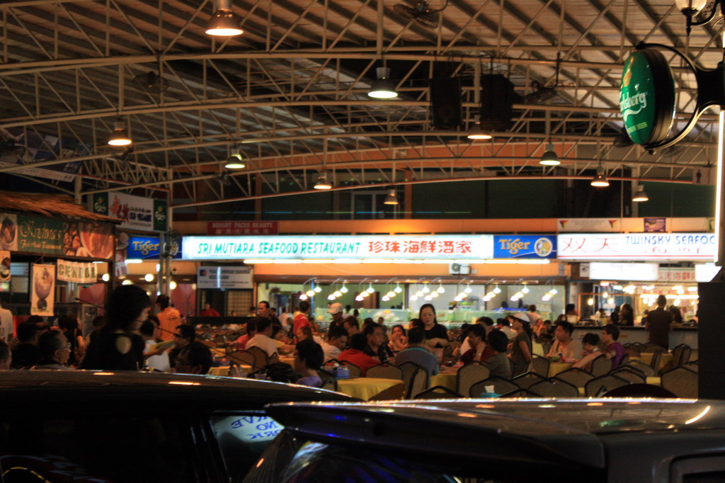 (Sedco Square) 这里就是Sedco Square,看看多少人啊,几乎都是华人。 走进大棚,正对面的两家,右边的叫“双天”,左边的叫“珍珠”,都是华人老板开的,是这里面最气派的两家了,人气很旺,海鲜种类多,我甚至怀疑都是携程的攻略起了作用。