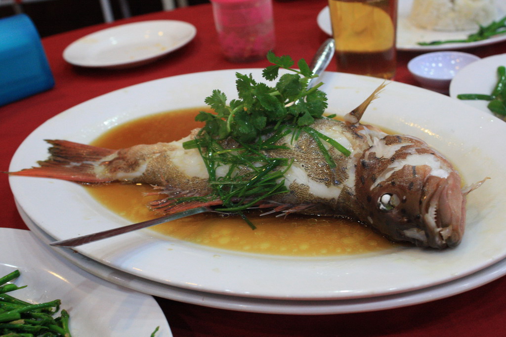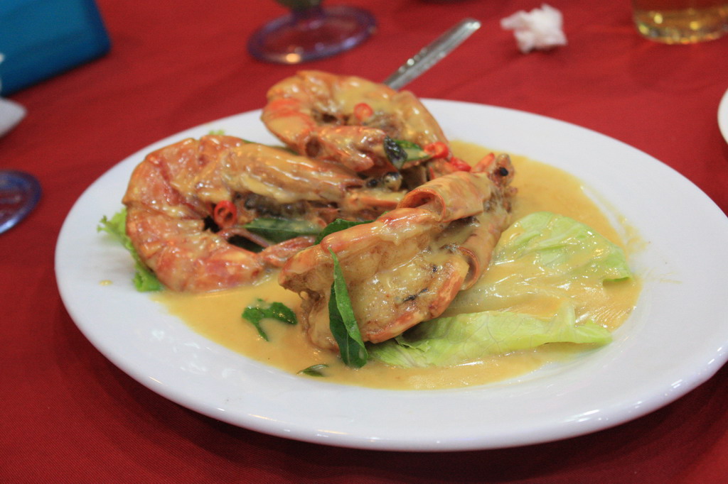(七星斑) 著名的七星斑,红色的,今儿就吃它了!红色的尾巴还很清晰呢。 我相信,只要看过携程马来攻略的,至少有一半人记得这道菜“奶油老虎虾”。