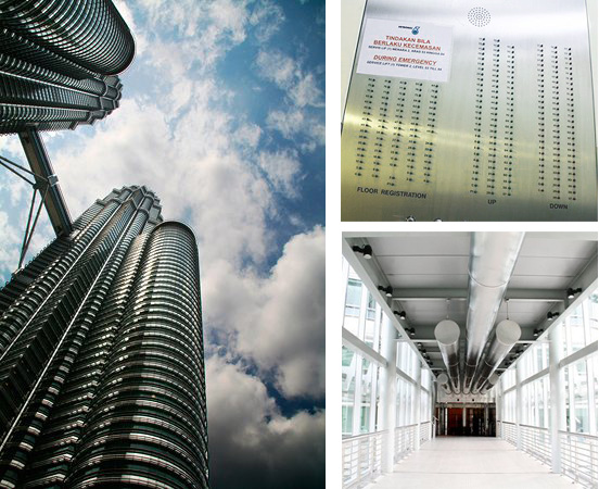 Sep.17 吉隆坡shopping日 俺向来对现代建筑兴趣不大,但是还是必须去偷天陷阱里重要场地双子塔上的天桥去看看。我们大约7点起,8点出发去双子塔地下一层领票点领免费参观票。人不少,但是也挺快的,我们领到了9点15的票,给bochao俩领了11点的票。 现在展示厅里转了一圈,展示厅里采用了各种新媒体技术让人们体验到双子塔建设过程、设计理念和她的高度。正式参观前,给大家看了一段3D电影,具体讲什么我给忘了。。高速电梯真的是很快, 上40层比俺们停停下下上西格玛5层还快,而且还没什么感觉。