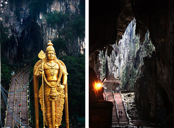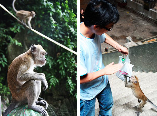 Sep.16 有妖怪出没-吉隆坡黑风洞 一大早顺利在sogo后方找到了11路公交车,正对着远方的双子塔。与其说找到站牌不如说找到了个停车点。Malaysia的公共汽车站居然没有任何站牌,人们只是站在固定的停车点对任意一个来往的bus招手即可。 坐上11路公交车,1.5RM/人,来到Batu Cave黑风洞。如果不是周边日渐繁华,否则黑风洞正如其名,象是妖怪们出没的地方。而现在是一个印度教的圣地。里面雕塑的故事我是不知道了。只大约知道个白度母和绿渡母。