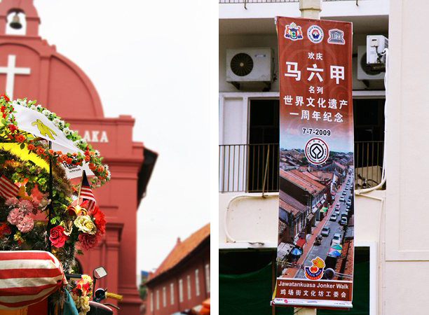Malaysia: Sep. 18偶们是世界遗产—马六甲工委会宣 Melaka~! 我深刻的觉得一定要好好宣传一下马六甲~!由于以往游记上都没有多少关于马六甲的描述,导致我们设计行程时只在马六甲花一天的时间。这是非常的失误。大家想想丽江小镇,如果你决定在丽江呆多久,就值得在马六甲待多久。 转车:从KL去Melaka是一件很奇怪的现象。先得说一下吉隆坡机场离吉隆坡有多远,大家可以看地图,KL在雪峨兰州的中部, 而机场虽然叫做“吉隆坡机场”但却在雪峨兰州的最南端。我们去Melaka,先要到KL center一个所谓的车站去买coach的票,但是买完票后,给告知还要做2RM的bus去真正的长途汽车站。上了车,车在往机场方向开,基本上开到了和机场一样远的地方看到了长途汽车站(旁边有家乐福)。有一趟轻轨可以通到这里。而回来的车更有意思,他会停两个站点,第一个站就是出发的站(Bukit Jalil),可以从这里坐轻轨到市中心;而第二个站(Subang Jaya)则要远得多,虽然也算是KL但是一片荒郊,交通非常不便。但这些,司机都不会告诉你。回来一定要坚决要在第一个站下,否则就可以深刻感受什么是叫天天不应叫地地不灵。这么说吧,本来你想去东直门,但被拉到了大兴黄村。 车上呼呼大睡,大约要两个小时到了Melaka,此时已是下午1点。Melaka的长途汽车站和KL一样距离市中心比较的远,需要坐bus车进城。原本只本着到此一游随便看看的想法,但是当乘坐的bus车开进市中心,我们看到马路两侧的传统小楼时,后悔之心又迅速跳上了心头。。。bus车也不怎么报站,我们估摸着到了中心广场,赶紧下了车。果然,没错。