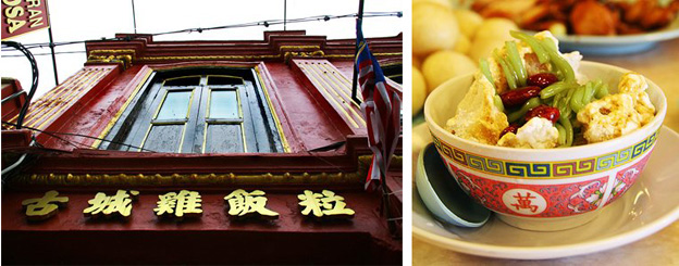 鸡场街 鸡场街的第一个大楼就是三叔公饭店,很有广东风味。走了没多久,就看见一个装修的金碧辉煌的中国饭店:海南鸡饭粒。外面放了老板的真人画像,写着“香港食神”。过来的几个香港游客都纷纷和该画像拍照留影,这证明了人家是个货真价实的食神哦。 毫不疑问,我们就在这吃了。真是个不错的饭店啊~!味道非常的好!是我们在Malaysia吃的最好的一顿。强烈推荐娘娘晶露,但是一定要是本店产的。  吃完饭,我们分头行动。Gaoxia家继续其shopping之路。我们沿着LP上的指示步行参观各建筑。文化的融合在此又充分体现,清真寺、印度寺庙、中国会馆相隔不过几米。