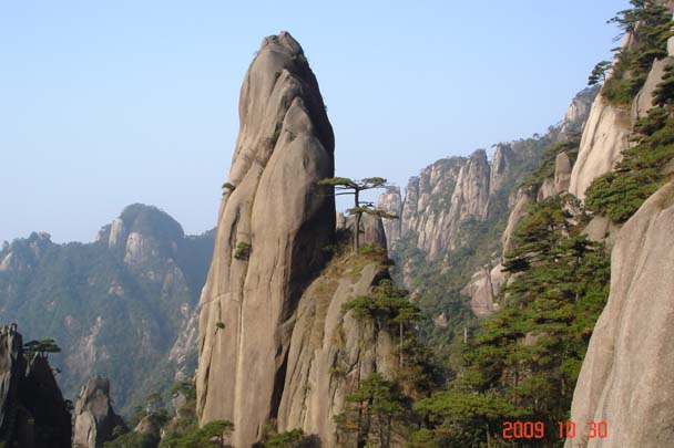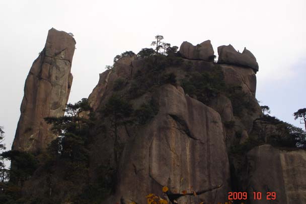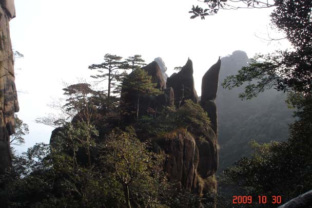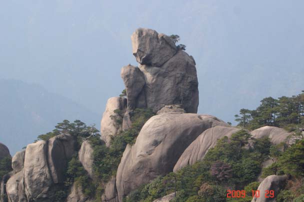 三清山座落于江西省玉山县北50公里处。因玉京、玉虚、玉华“三峰峻拔,如三清列坐其巅” 故名。景区总面积220平方公里,主峰玉京峰海拔1817米,为怀玉山脉的主峰。1988年8月经国务院批准,列为国家重点风景名胜区。2008年7月列为世界遗产地。三清山以自然山岳风光称绝。峰峦“奇中出奇,秀中藏秀”, 被誉为“黄山的姐妹山”。 她东险西奇、北秀南绝、中峰巍峨,既集结了名山大川的精华,又展现了别具一格的风采。 本人1998年夏季去过一次,那是参加景德镇印机厂组织的会议。但那一次正巧碰上山洪爆发,因此基本上没游成。三清山共有:南清园、西海岸、东海岸、三清宫、玉京峰、万寿园、梯云岭等七大景区。一般旅行团都是一天上下,游三个景区。因此我准备这次要在山上住上一晚,把三清山的景点全部游览一下。 三清山游览的线路一般分为:西海岸—三清宫—玉京峰—东海岸—南清园—万寿园—梯云岭。还有一种为:南清园—东海—玉京峰—三清宫—西海岸—万寿园—梯云岭。我们选择了第一种,这样相对省力些。从“日上山庄” 向左,就有指示牌引路。先上一段台阶,大约40分钟就登到了山顶,接下来就是走在山谷的栈道上,这里几乎是平的,弯弯曲曲地一直沿着西海大峡谷沿伸着。周边的景色十分迷人,到处都是奇峰怪石,苍松翠柏,云雾缭绕,如若仙境。在西海岸看到的第一景点是:神童负松,那石头一大一小,大的象身体,小的象小孩的头,在大石头上长着一棵松树。远看就象一个小孩,背上背着一棵松树在向上攀登。接下来的景点还有:观音送子、九天锦屏、山盟海誓、妈祖导航、猴王观宝、仙桥墩、西海港湾、葫芦湾峡谷、飞仙谷等,在这里你就好好地顿足遐想吧。 在栈道上走了1个多小时到了一个分叉口,直行去三清宫,右转去东海岸。我们直行,路开始下坡,有一段路上还面铺着木板,经过涵星池、清华池、净衣池,就到了三清宫。三清山以道教文化渊源显胜。相传东晋时就为“葛仙修道之所”, 自古享有“清绝尘嚣天下无双福地,高凌云汉江南第一仙峰” 之盛誉。三清宫踞九龙山口,位八卦之中心。风雷塔、龙虎殿、方士羽化坛、演教殿、九天应元府、丹井、飞仙台等依八卦排列,充满玄机奥秘。三清宫内香火正旺,老道忙碌着叫你抽扦算命。我们经过40分钟,又绕回到刚才的叉道,继续向东海岸前行。 前行没多远就有指示牌指引上玉京峰的路,“不登玉京峰,难得三清妙”。我们开始攀登玉京峰了,这时是中午12点10分。一路上几乎没有人,我们走走停停,在半山腰处的一个平台上,总算碰到了6位广西人,他们有一个人己经先上去了。我们在那里休息了一会,拍了几张照片后又继续向上,就这样终于化了45分钟到达了山顶。站在玉京峰上,群山俱伏脚下。山顶的石头上刻有“玉京峰”“ 德配天地”“ 天下名山”“ 仙境” 等字样。我们在那里拍了许多照片。在朝阳的一面还建有一石殿,供奉着不知那路神仙,我们拜了拜就下山了。下山要比上山轻松多了,在路上又碰到了二批人,最后我们在下午1点20分回到了去东海岸的路口。 东海岸也称阳光海岸,它同西海岸一样,也是在山的石壁上修建的栈道。比较平坦,我们沿着栈道游览着。在东海岸见到的第一景点是;田字石, 接下来的景点还有: 渡仙桥、乾坤台、五老朝圣、国舅悟道、白头偕老、仙人指道、葛洪献丹。特别是乾坤台,它是在栈道上用玻璃铺成的一个平台。为什么叫乾坤台呢?乾是天,坤是地。那么站在这个观景台上,低头向下看,就是陡峭的山崖下的大地深渊,再看,倒映在玻璃上还有我们头上美丽的蓝天白云。当然还有站立在天地间的自己,所以这是一个天地合一的乾坤台,或者称为天地人合一的三合台。不少人都小心翼翼的站在上面拍照留念,有的游客吓得心惊肉跳。我们也上去照了几张像。大约在下午2点45分,我们到了又一个交叉路口。左手到南清园,右手去日上山庄。南清园最费体力,我们准备放在明天。 接下来我们朝右手方向走去,这一路上也有不少景点。第一个景点是:福寿门,接下来还有:老庄论道、和尚打伞、玉兔奔月、仙姑晒鞋、天门峰丛、观音赏曲。福寿门是一个山体中间有二个大缝下面凿了台阶,人从缝中走过如同走进大门一样的感觉。当时我在上面,看见一个女游客从下面走上来,我大声说:“你走错了,男左女右”, 那游客听我这么一说,果真退下去重走了。笑得我腰也直不起了。其实我也分不清那边是左那边是右,后来我们过去后,还听有人在叫“男左女右,男左女右”。 再向前就到了今天晚上我们住宿的地方“日上山庄”, 3点15分我们回到山庄。休息一会再去万寿园。 4点钟我们前往万寿园,万寿园在索道上站旁。一进去就可看到一个老寿星的巨大塑像,沿着台阶向上看见第一个景点是:海狮吞月,接下来还有犀牛石、树崩石、观音台。在这里也能看天门峰丛、观音赏曲。这里面全是起起伏伏的台阶路,有的地方还要上下楼梯,地方不大却也精致。在这里我们花了1个小时结束了万寿园的游览,同样也拍了不少照片。回到“日上山庄” 己经是下午5点半了,今天的游程就此结束。晚上洗个热水澡,早早的休息了。 这时己经是11点钟了,正好有一辆中巴车去玉山,我们上车后车就开了,中午12点10分到达玉山汽车站。再转三轮摩托车去火车站,到那里一看售票厅要到下午1点才开